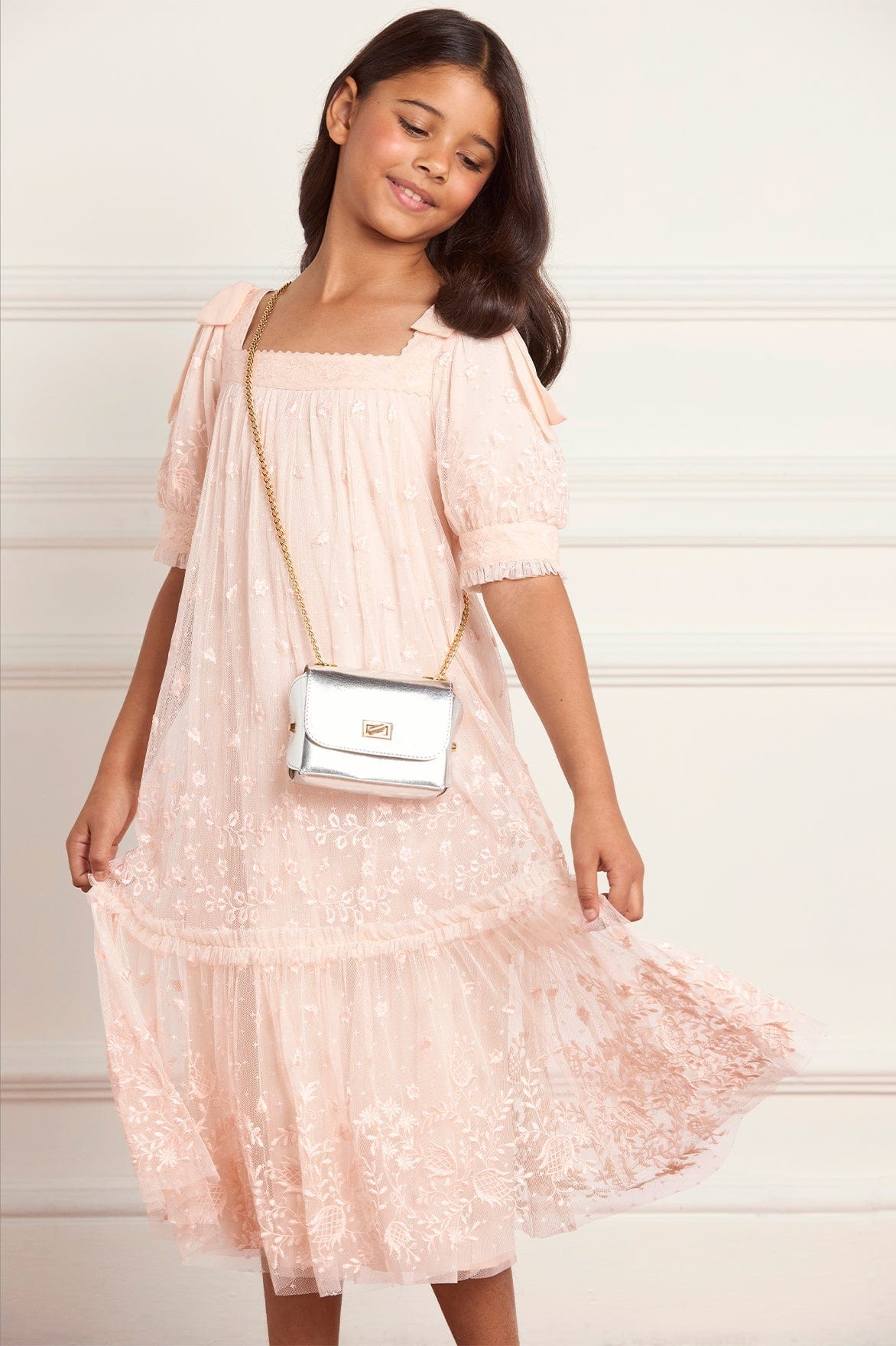 The Alma Kids Dress in Opal. A delicate, vintage-inspired style decorated with floral embroidery across signature Needle & Thread kisses 'x' motif tulle. The soft opal tone and multi-layered skirt creates a beautiful silhouette, perfect for unforgettable moments.
