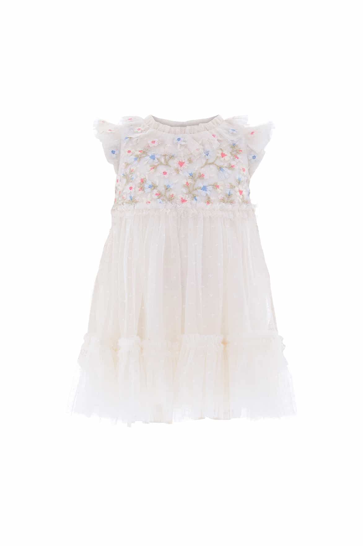 The Antoinettes Floral Bodice Baby Dress in Cream. A dreamy piece inspired by the romance of Versailles. Crafted with delicate multicoloured floral embroidery scattered across a cloud of tulle, signature frills at the neckline and waist add a touch of enchantment. Designed with layered tulle sleeves and a gently ruffled skirt, it creates a floaty, ethereal silhouette. Finished with a breathable cotton voile lining and frilled bloomers for comfort. This dress is perfect for every magical moment.