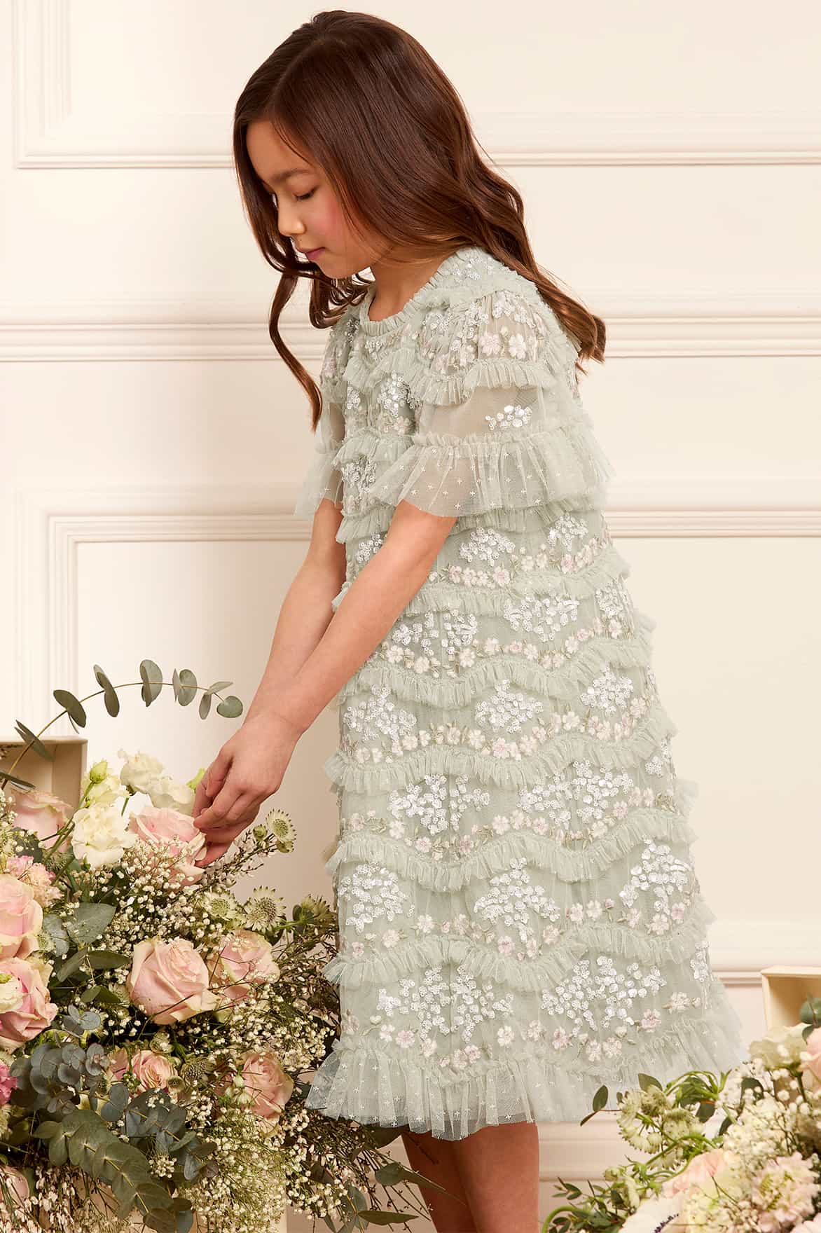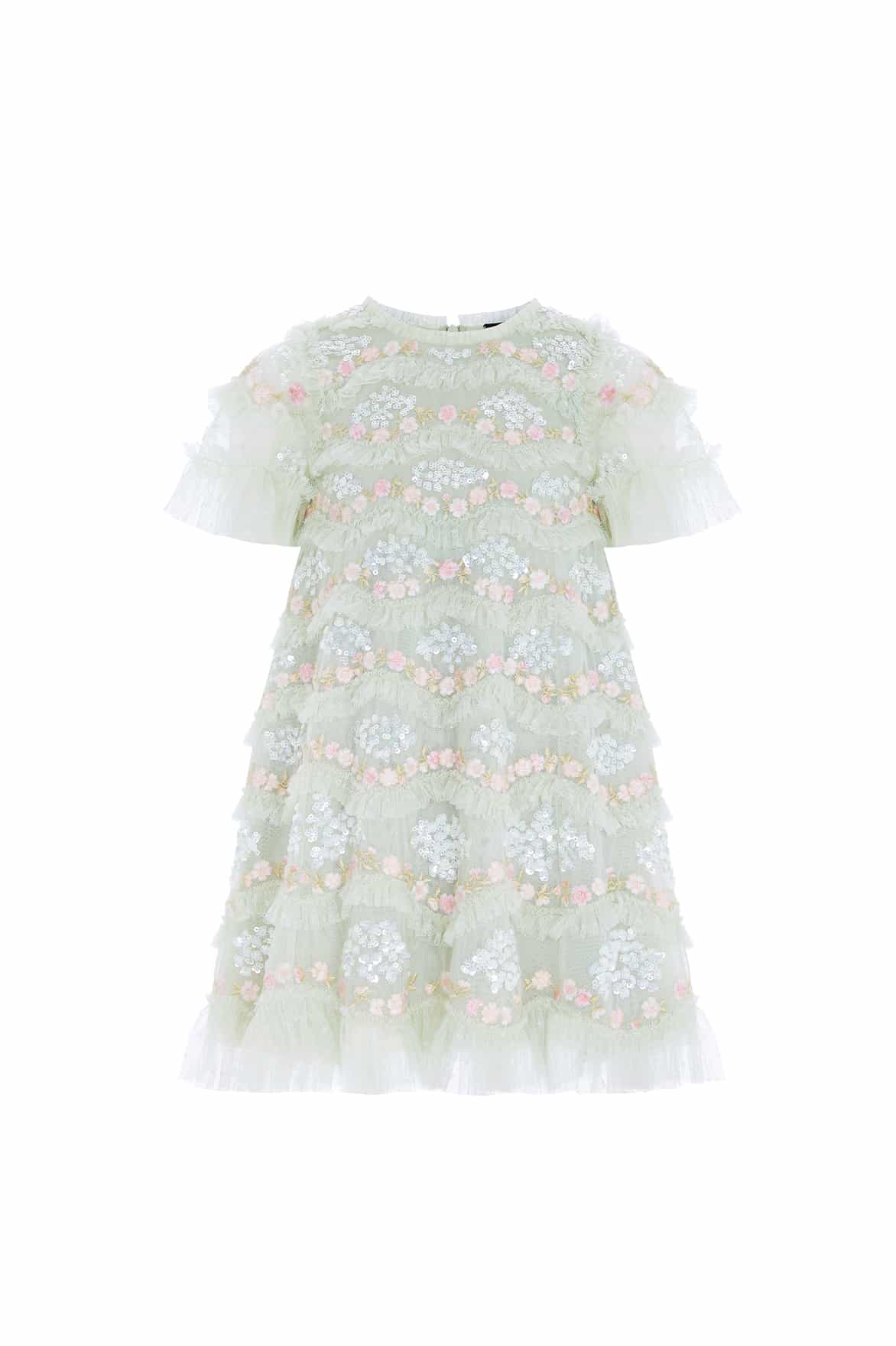 The Daisy Wave KIDS Dress in Mist. The artwork for this style has been inspired by our 'Daisy Wave' print. Designed with an exquisitely detailed textile, it is created using undulating borders of gathered tulle frills with interspersed intricate lace. Featuring floral artwork with embroidery and shimmering sequins. The perfect dress for an upcoming special occasion.