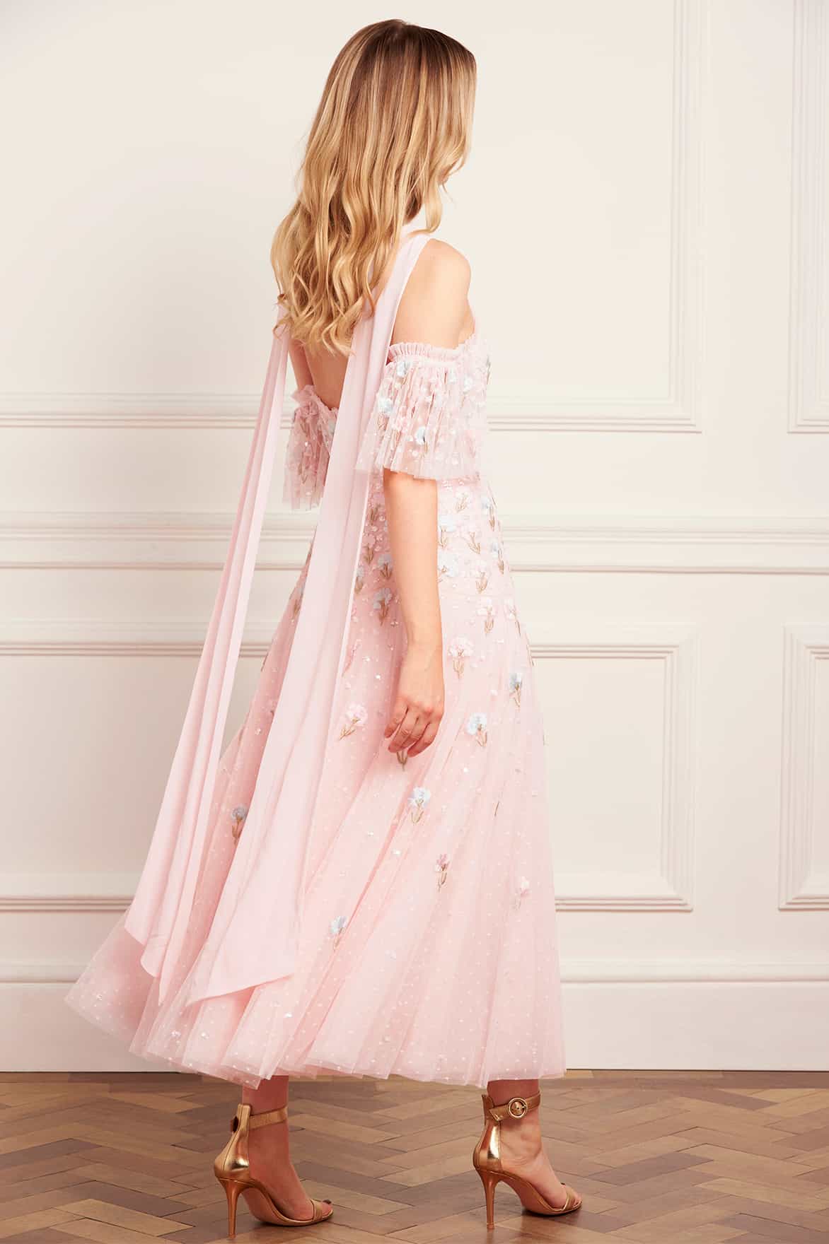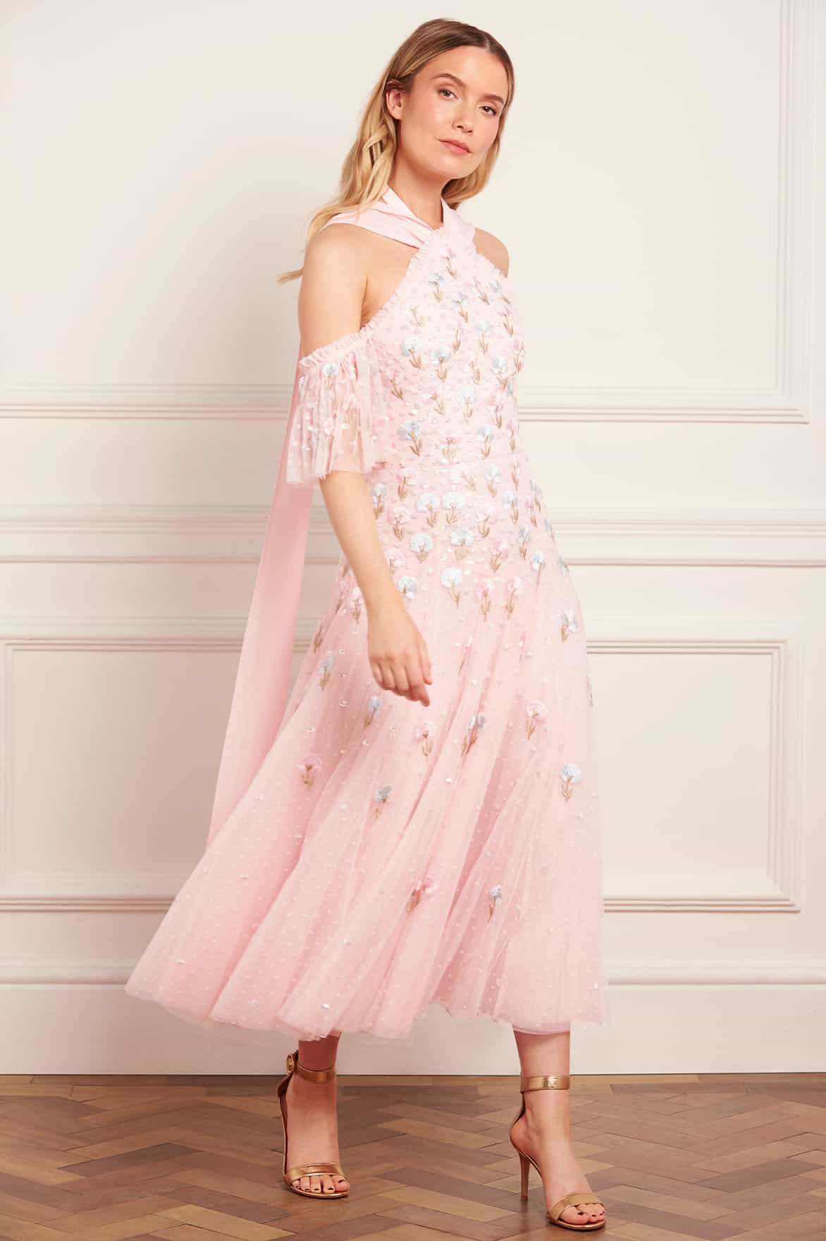 NEW SEASON. The Dandelion Ditsy Halter-Neck Ballerina Dress in Seashell. Showcases embroidered dandelion motifs in soft pink and blue tones. With its halter neckline and layered tulle ballerina skirt, this piece exudes whimsical romance and graceful movement.