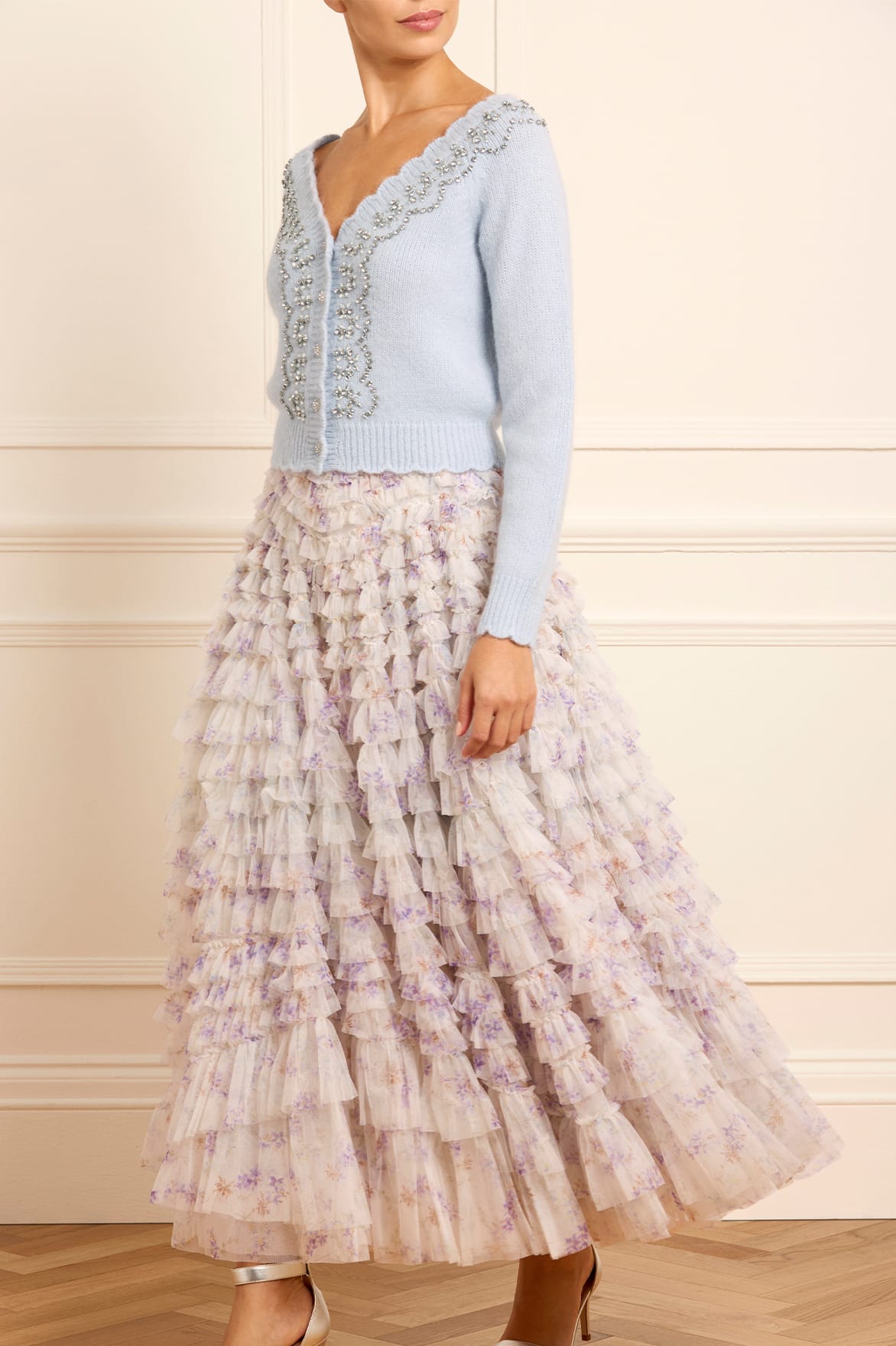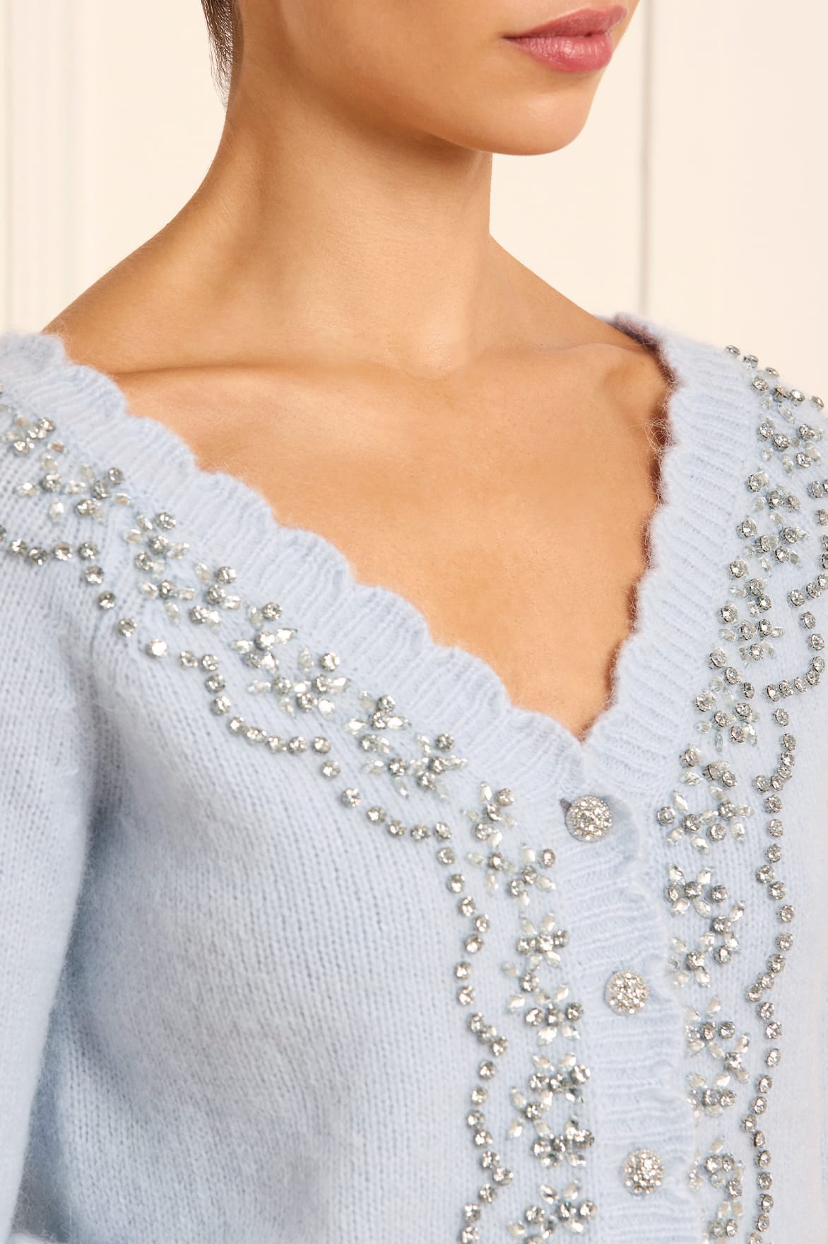 The Embellished V-Neck Short Cardigan in Pale Blue. This cardigan features a glittering embellishment inspired by delicate vintage lace. The neckline is adorned with crystal gems for romantic styling. Developed in soft merino wool blended with cashmere for a feminine texture, this cardigan has a short silhouette with slim-fit sleeves and body. Designed with a V-neck, scallop detailing, and jewel buttons for a signature Needle & Thread look.