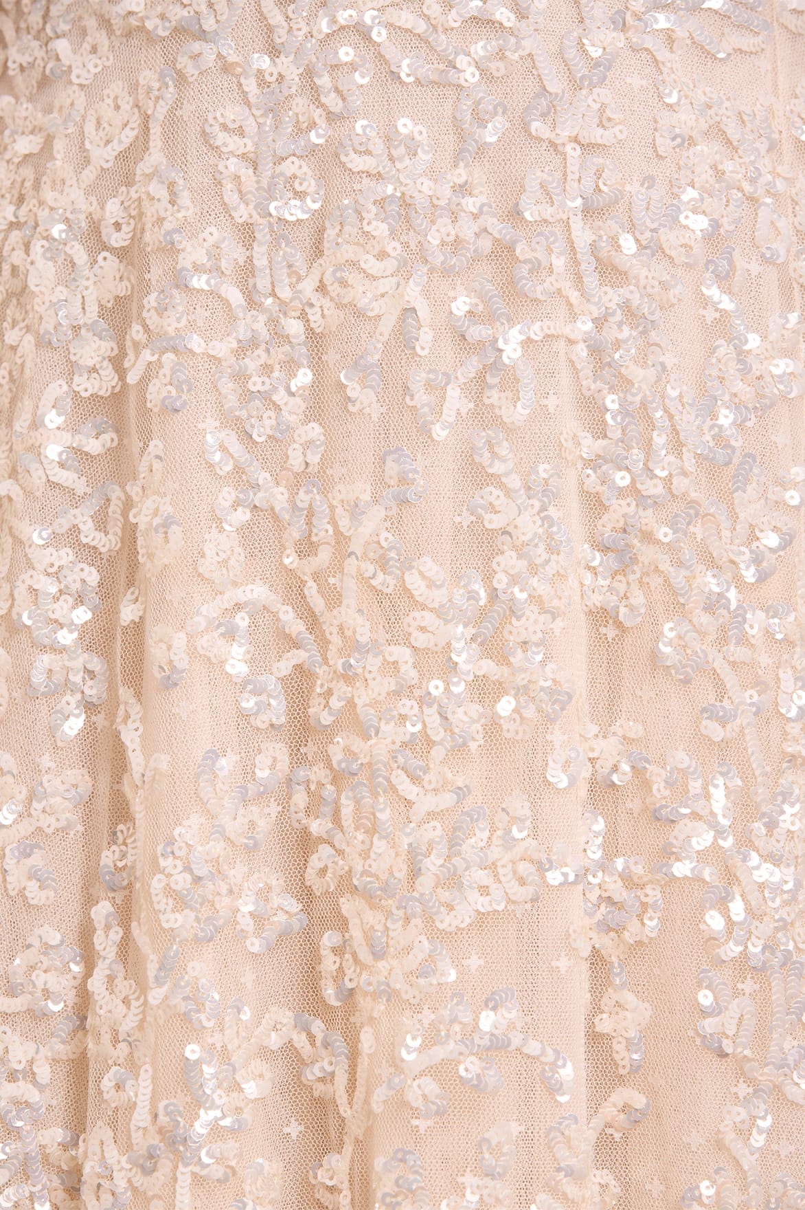 The Floral Lace Off-Shoulder Ankle Gown in Cream. This beautiful dress is embellished with tiny sequins in an overlapping linear formation depicting an exquisite floral design inspired by vintage lace from the early 1900s. The statement off-the-shoulder design has a flattering curved neckline and straps, adorned with signature Needle & Thread soft tulle ruffles. The fluted sleeves are decorated in frothy tulle ruffles and adorned with glittering sequins in floral motifs. The skirt is made up of generous layers of net and tulle with sweeping hemline. The perfect statement style for a special occasion.