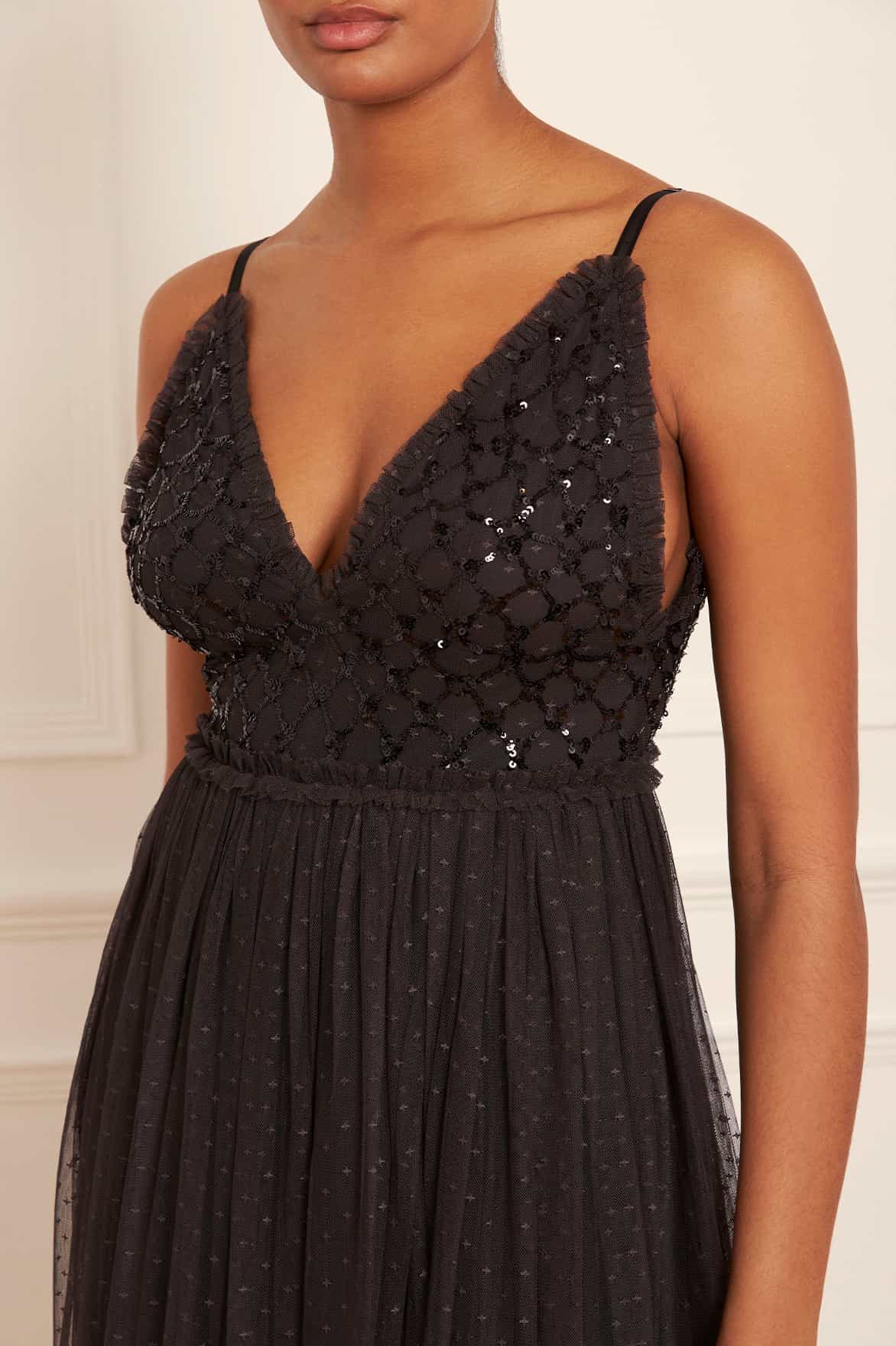 The Heart Lattice Bodice Cami Ankle Gown in Graphite. The bodice of this gown is decorated with intricate embellishment made using smallest sequins for exquisite detailing. Beautifully designed with heart-shaped motifs in a lattice layout. The skirt is developed with layers of frothy tulle to create effortless styling. The perfect style for an upcoming special occasion.