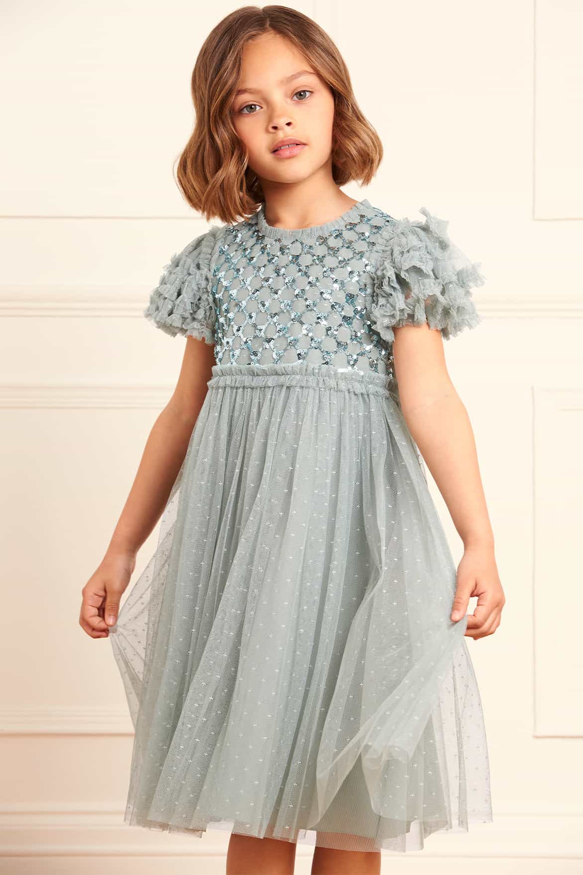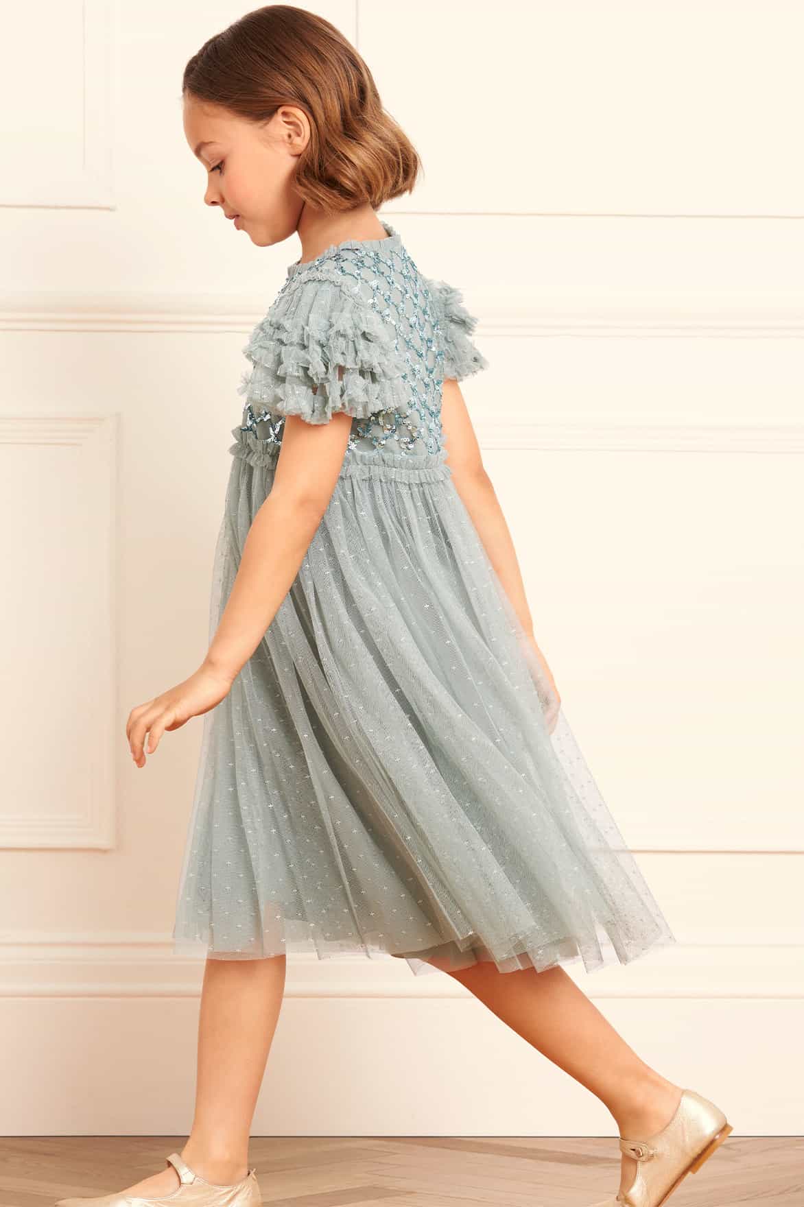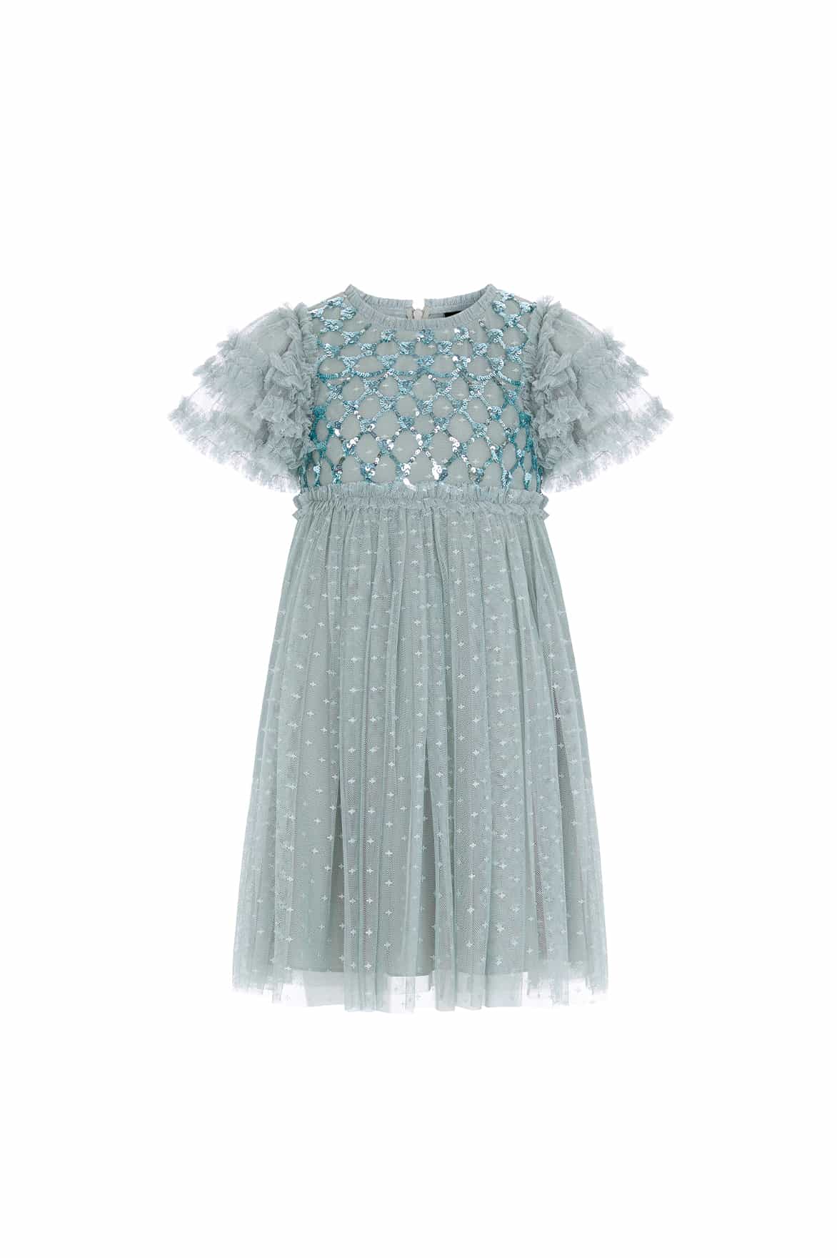 NEW SEASON. The Heart Lattice Bodice KIDS Dress in Sage. The bodice of this beautiful dress is adorned with intricate embellishment, created using the smallest sequins for exquisite detailing. Featuring delicate heart-shaped motifs in a lattice layout and a frothy tulle skirt for a statement look. The perfect piece for all your little one's upcoming occasions.