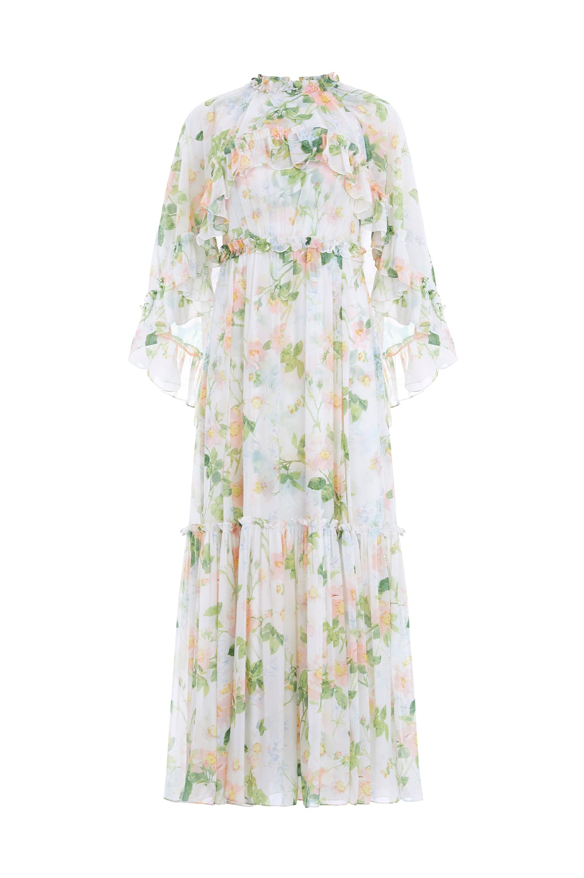 The Immortal Rose Harper Chiffon Cape Ankle Gown in Moonshine. This beautiful gown features a romantic print captured from an antique, hand-painted artwork from the early 1900s. Decorated with wild rose motifs in soft pink shades intertwined with green foliage. This gown features a dramatic yet elegant cape which has a detachable fastening for versatile styling. Developed in the softest chiffon for a romantic flowing silhouette. The perfect gown to take you from day to night.
