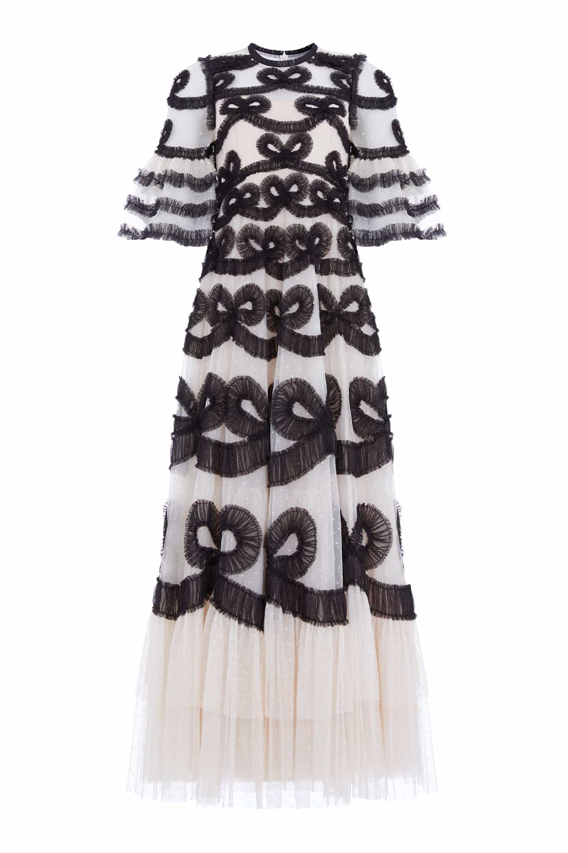 The Ingrid Gown in Cream / Graphite. This iconic Needle & Thread style is inspired by vintage ribbon bows. Beautifully engineered with delicate tulle and subtle texture to capture this ribbon motif. This signature Needle & Thread monochrome gown is bold yet truly romantic.