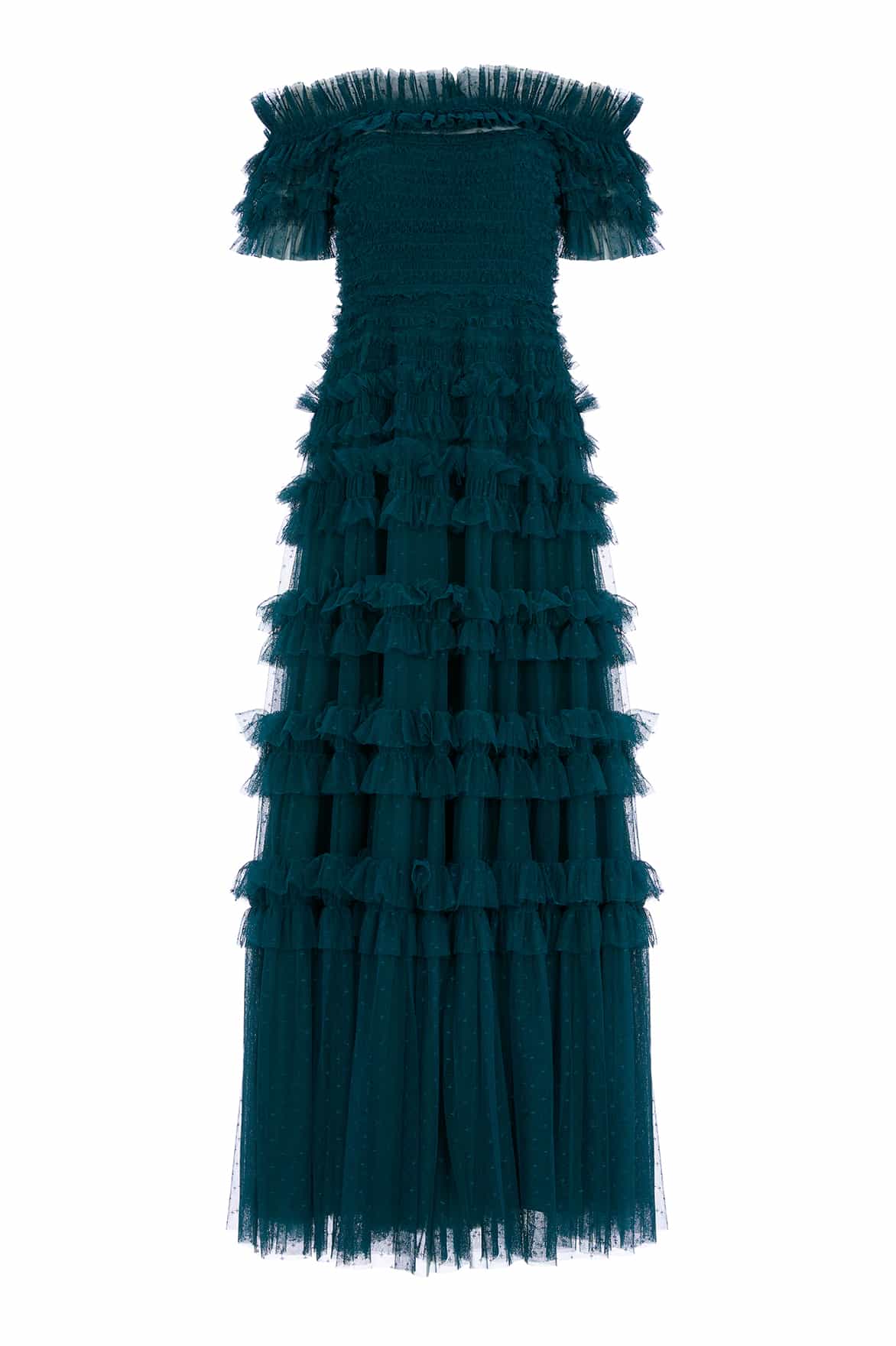 The Lisette Ruffle Off Shoulder Gown in Emerald. This statement gown has an elegant off-the-shoulder design inspired by Hollywood styling. Crafted with textile tulle and double-stitched frills for a dramatic, romantic effect. Features an integrated corset for a perfect fit and to hold the silhouette. Expect all eyes on you in this romantic gown.