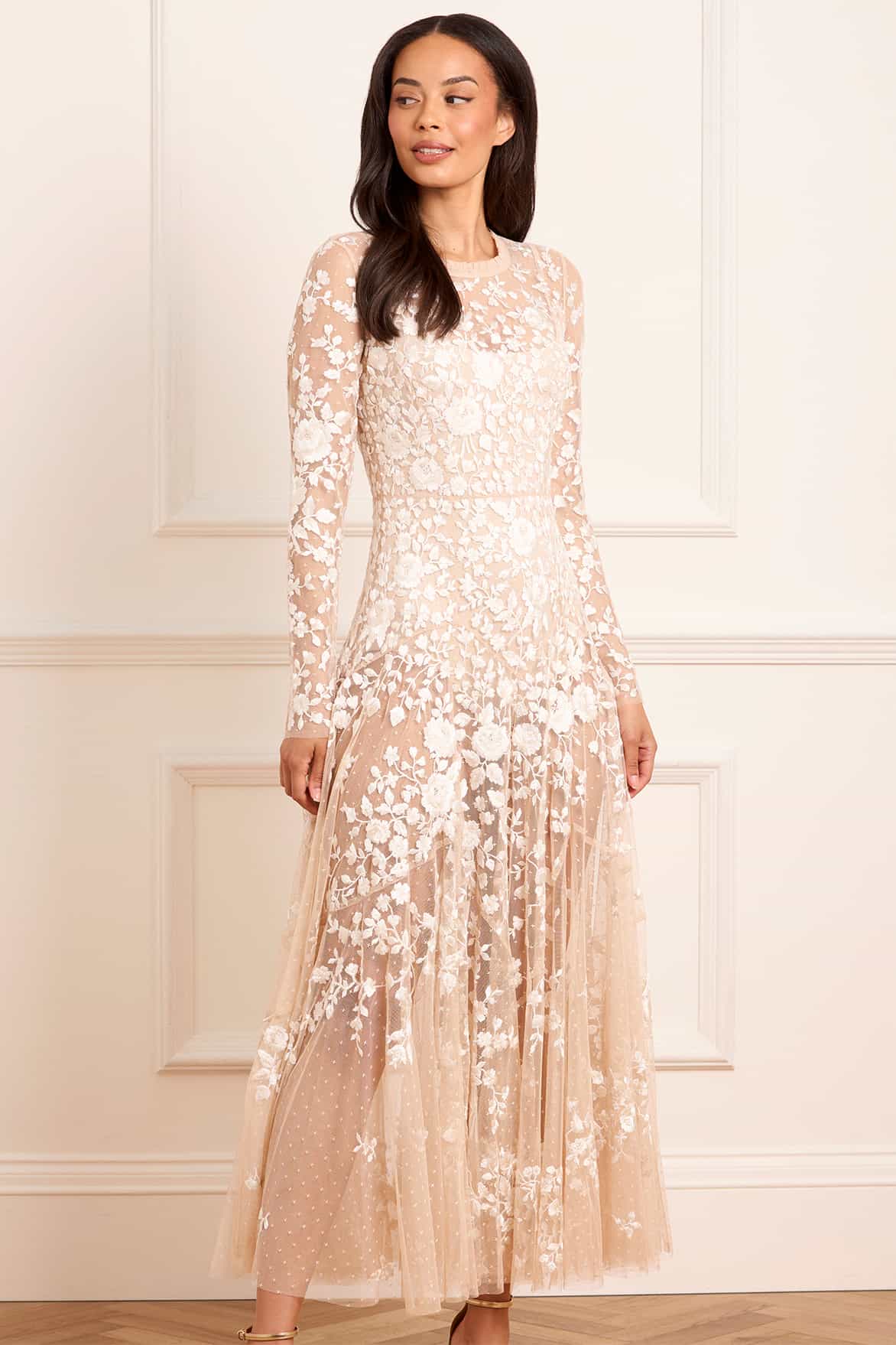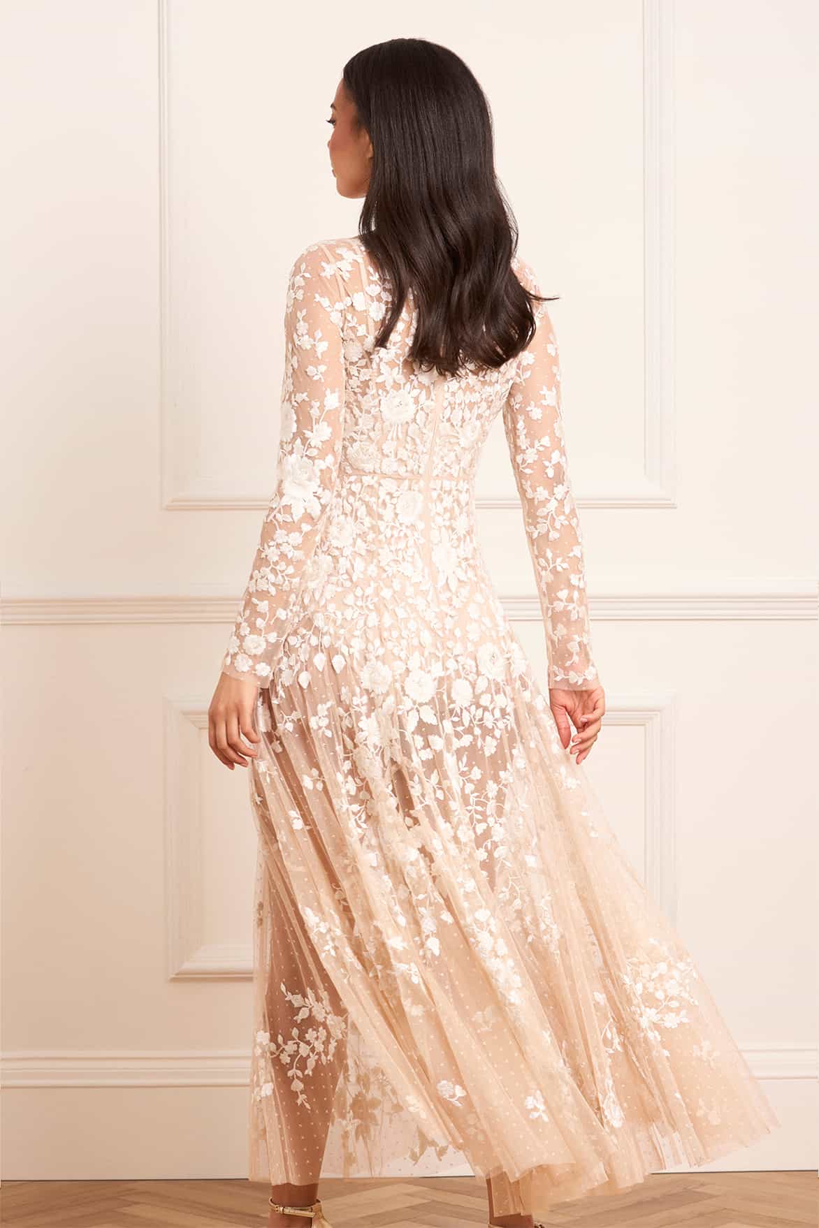 The Rosa Sheer Ankle Gown in Beige/Cream. An ethereal piece with luxurious contrast rose embroidery. Featuring a sheer outer layer and an integrated powermesh bodysuit for coverage, this style blends vintage artistry with a modern silhouette. Make a statement in this showstopping style.