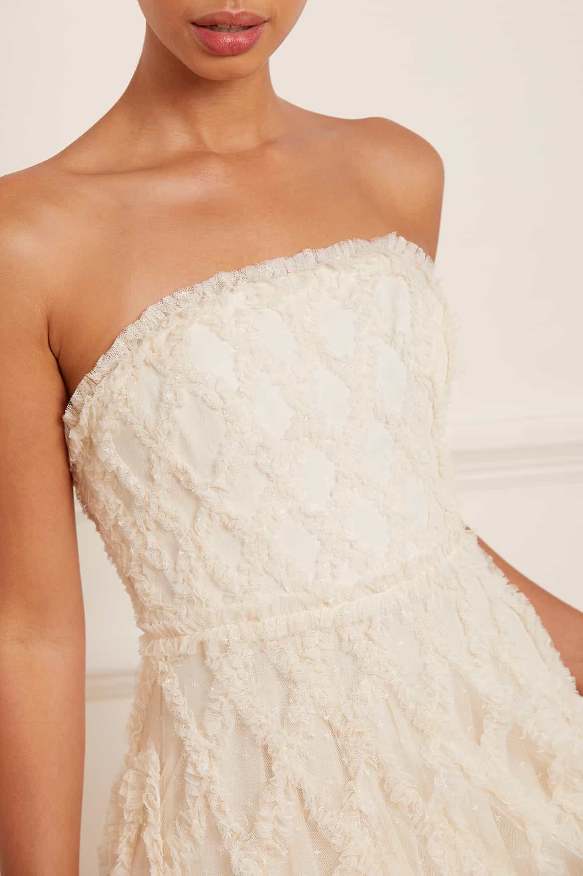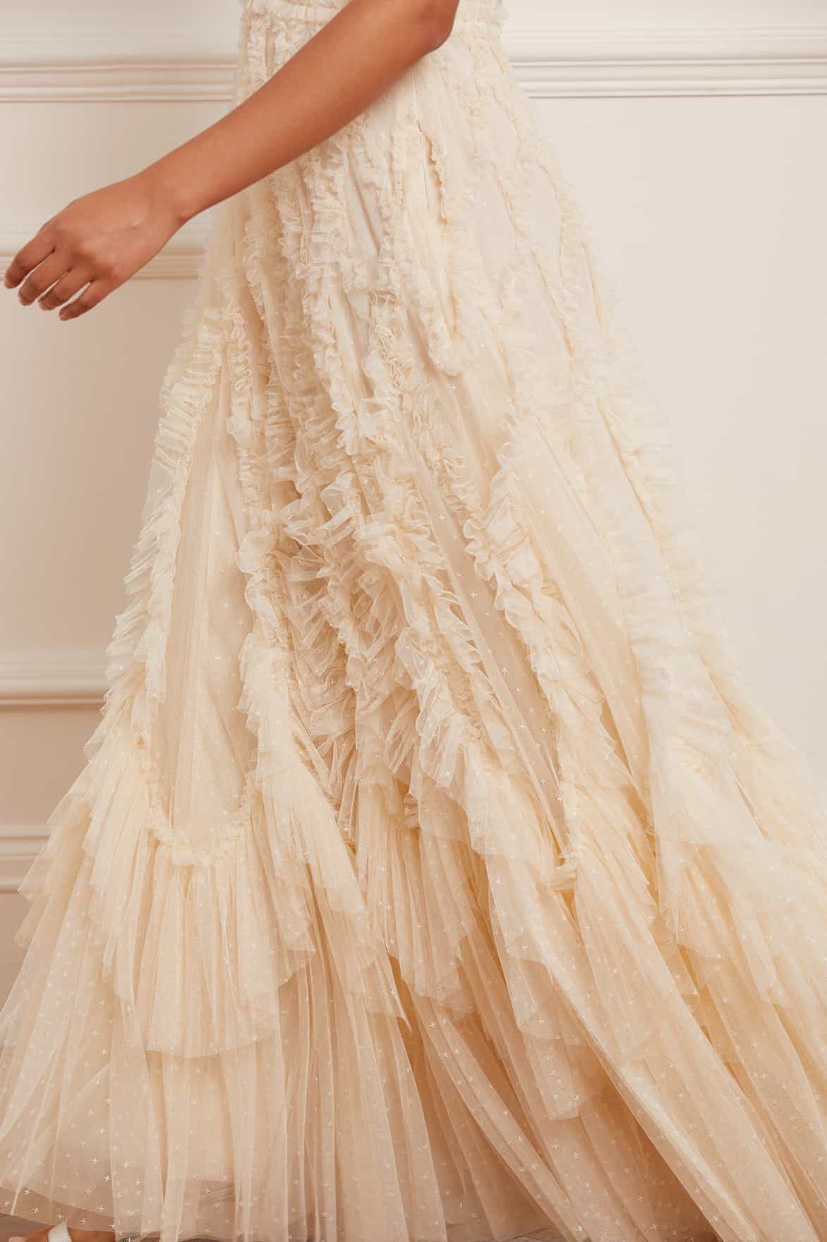NEEDLE & THREAD EXCLUSIVE. The Rosella Ruffle Strapless Gown in Champagne / Champagne. This show-stopping gown is inspired by Hollywood glamour. This gown is crafted beautifully with dramatic tulle frills for a statement look. Designed with over-sized scallops to create a flattering, elegant silhouette.Featuring an integrated corset made with ribbon stitching, soft boning and panels of stretch mesh fabric for comfort and security in the fit. Expect all eyes on you in the Rosella.