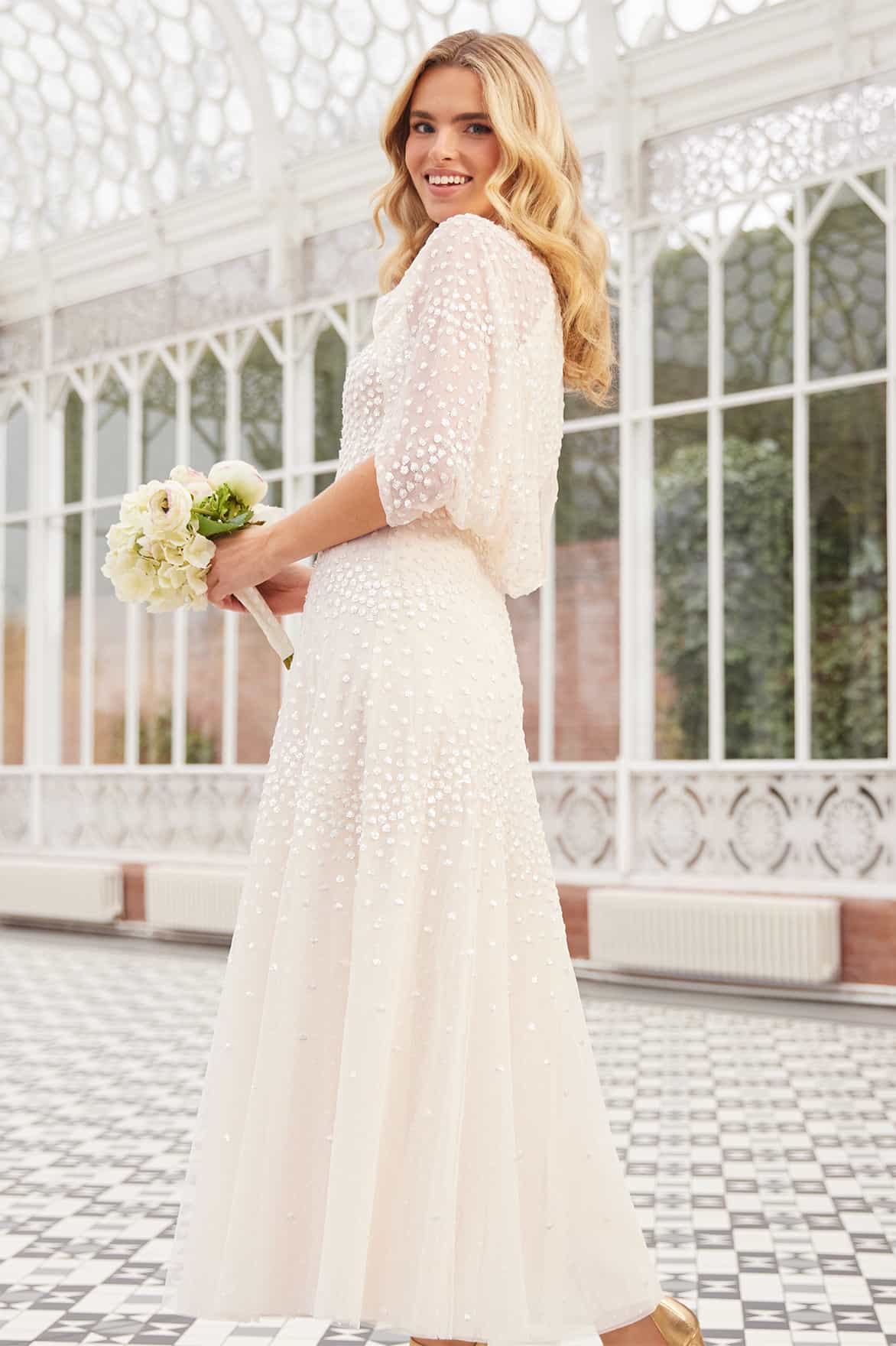 NEW SEASON. The Scallop Sequin Cape Ankle Gown in Cream. An elegant high-neck style with a blouson chiffon cape that gathers at the waist. Embellished with glittering sequins, it creates a dramatic yet graceful statement for evening occasions.