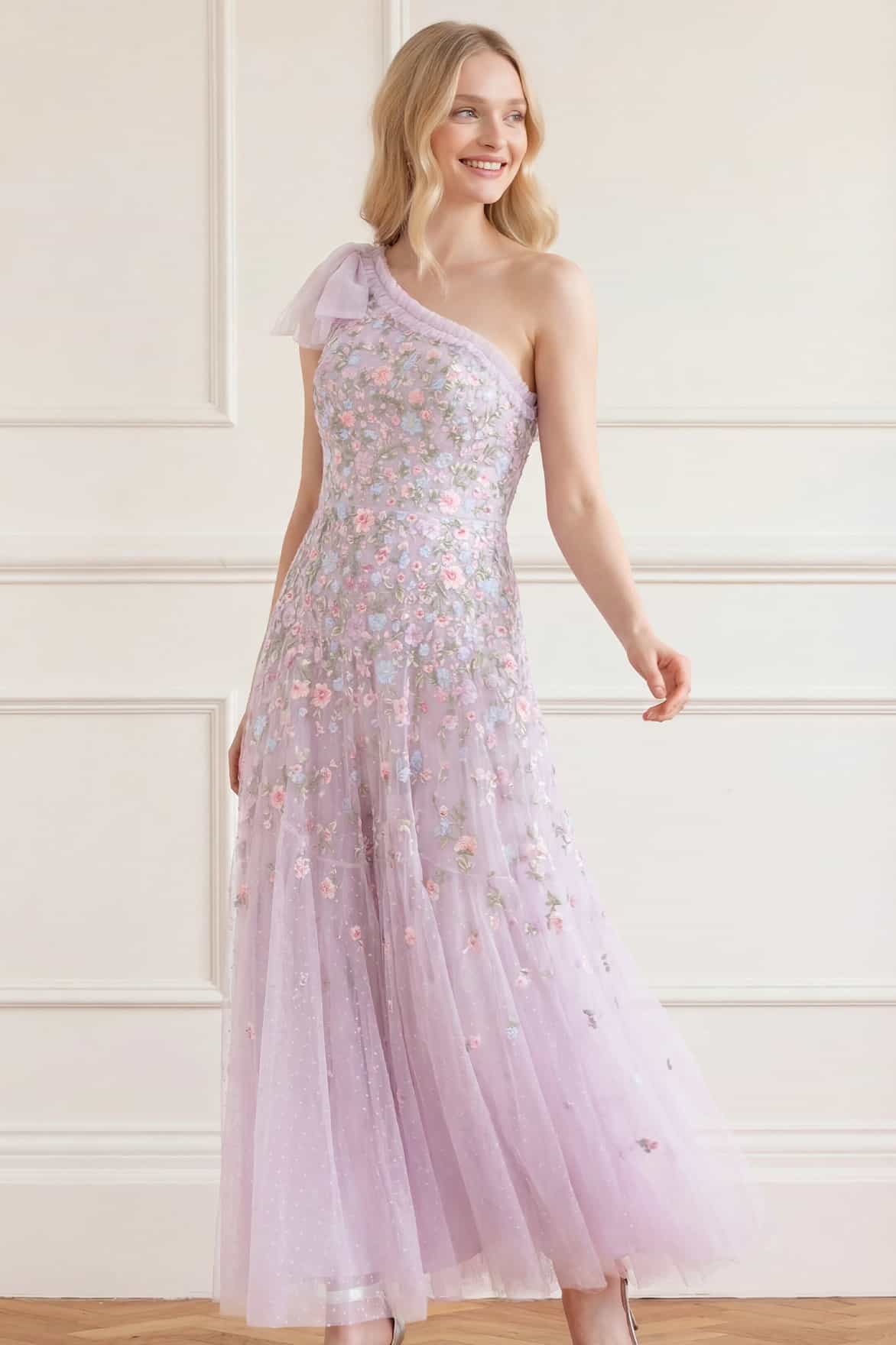 NEW SEASON. The Sylvia Rose One-Shoulder Bow Ankle Gown in Powder Lilac/Bright. This romantic gown features delicate floral embroidery arranged in softly graduated bands across the silhouette. Finished with a striking one-shoulder neckline and bow detail for an elegant statement.
