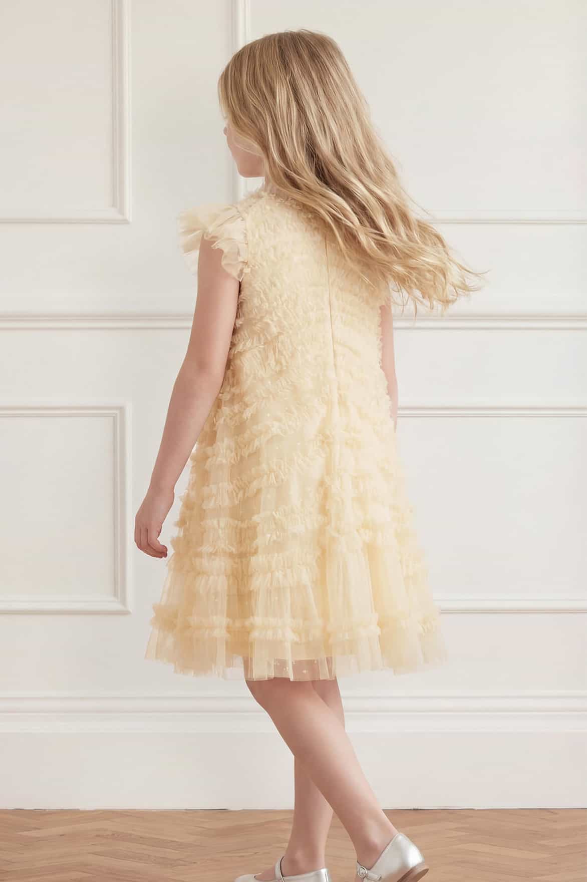 NEW SEASON | NEEDLE & THREAD EXCLUSIVE. The Amara Ruffle Sleeve Kids Dress in Lemon Sorbet. Designed with a relaxed shape, this dress features delicate ruffle sleeves and a full, twirl-worthy skirt with soft layered volume. Inspired by dreamy garden blooms, it feels light, special and comfortable. Beautifully complemented by coordinating the Amara Backless Ballerina Dress.