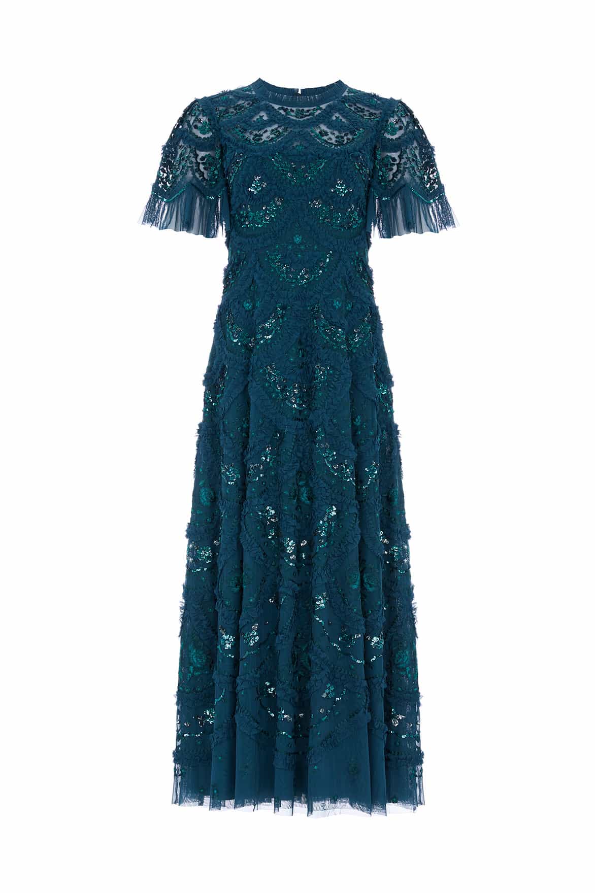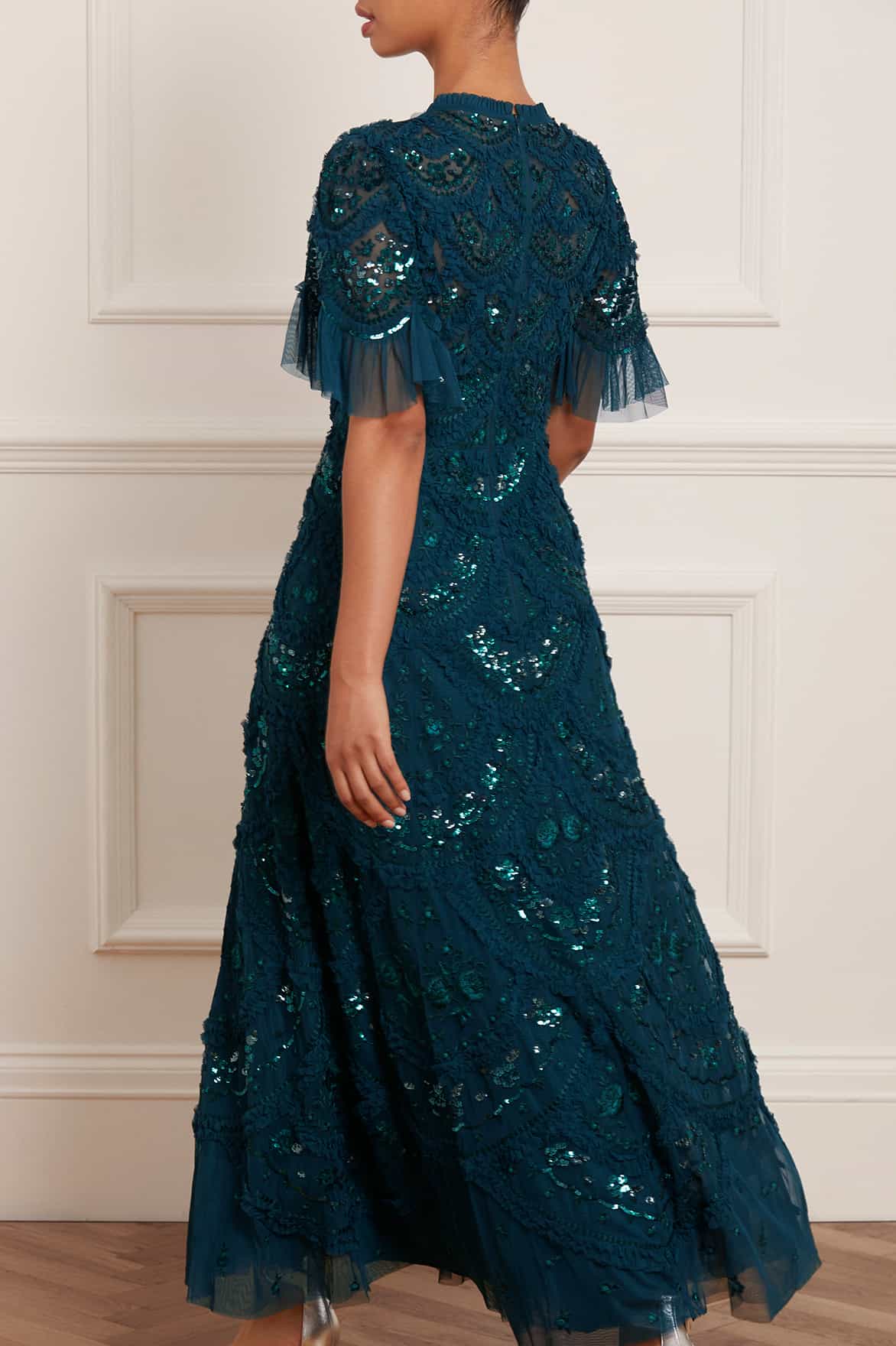 NEEDLE & THREAD EXCLUSIVE. The Carmen Ruffle Ankle Gown in Emerald. Designed with delicate tulle ruffles shaped into scallop sections, perfectly positioned to create a signature Needle & Thread romantic, textured look. This gown is beautifully embroidered with floral vine borders, featuring highlights of lustrous sequins for a glistening effect. A new wardrobe favourite.