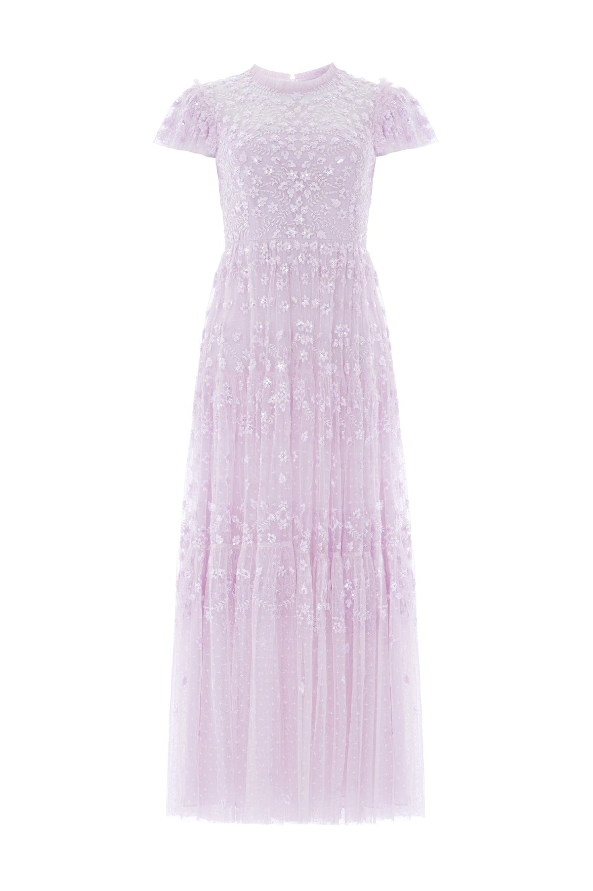 NEW SEASON. The Clover Short Sleeve Ankle Gown in Powder Lilac. This elegant gown features a refined short sleeve silhouette inspired by painted English gardens. Finished with a fluid ankle-length skirt, it creates a timeless and feminine shape for special occasions.