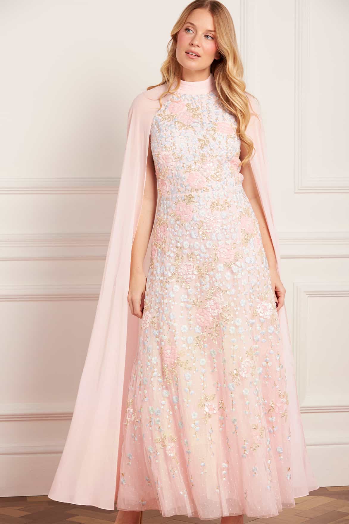 NEW SEASON. The Cressida Floral Cape Ankle Gown in Seashell/Multi. Features exquisite embroidered blooms and a delicate chiffon cape. Designed with raglan seams and soft movement through the skirt, this gown evokes ethereal romance and graceful sophistication.
