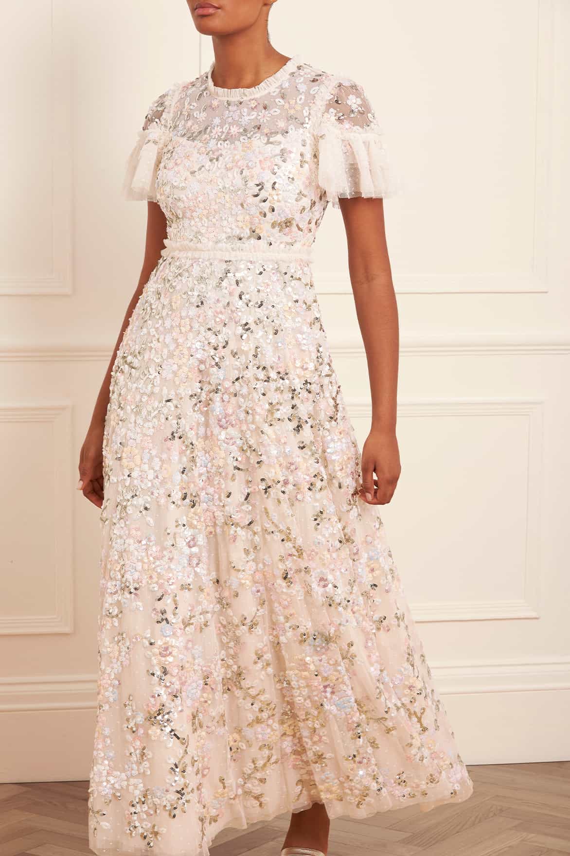 The Dream Garland Gloss Round Neck Gown in Cream. This embellished gown is beautifully scattered with high-shine sequins in a floral garland artwork inspired by an early 1900s illustration. Beautifully decorated with specially sourced ultra-shine sequins in pretty pastels. Developed with a generous, sweeping skirt made from layers of tulle and net to create a signature, statement look. The perfect style for an upcoming special occasion.