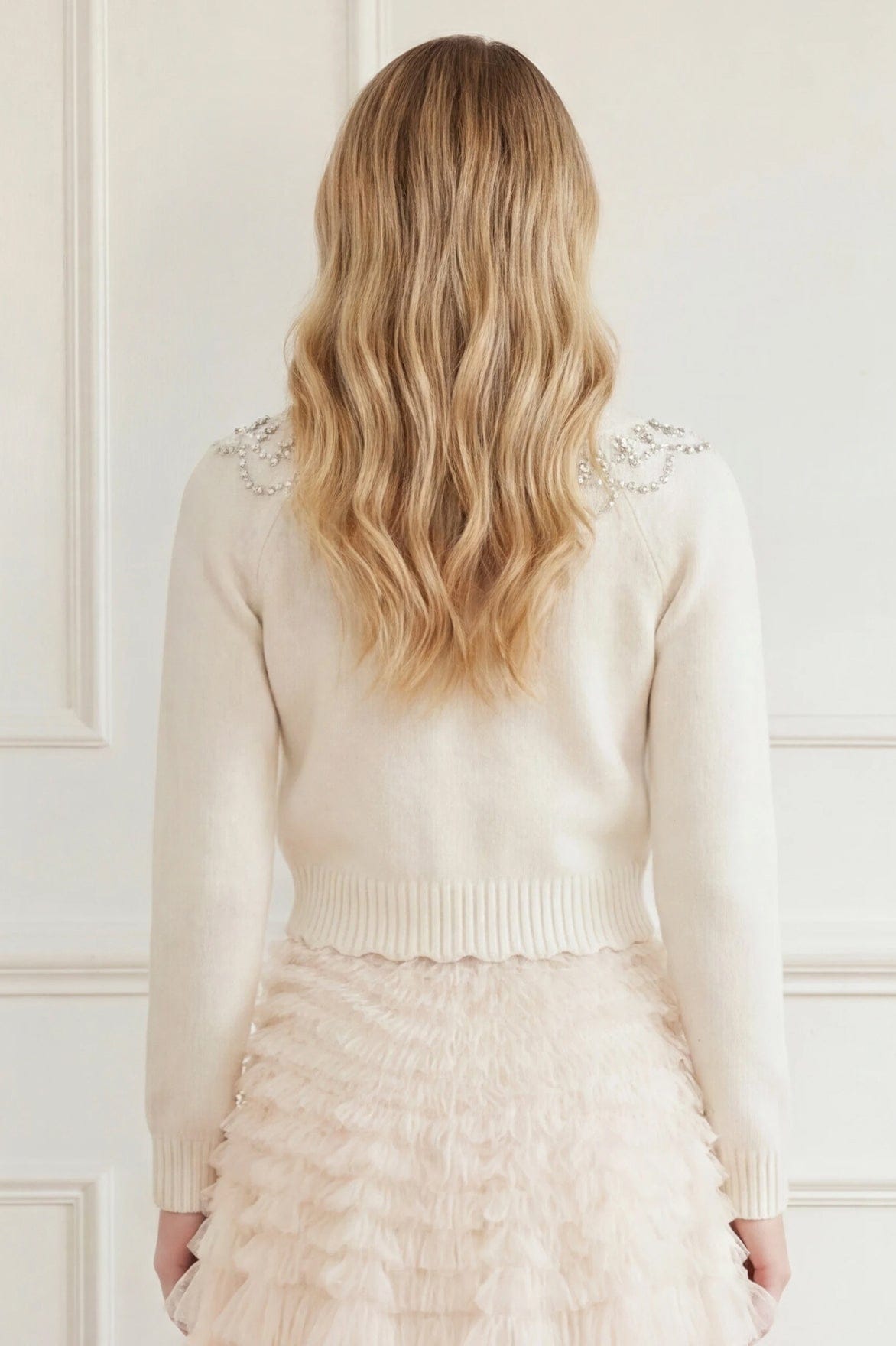 NEW SEASON | NEEDLE & THREAD EXCLUSIVE. The Embellished V-Neck Short Cardigan in Cream. Thoughtfully crafted with intricate embellishment, this piece exudes understated elegance. Designed with a flattering V-neck and a softly contoured fit, it adds subtle texture and a graceful shimmer to your look.