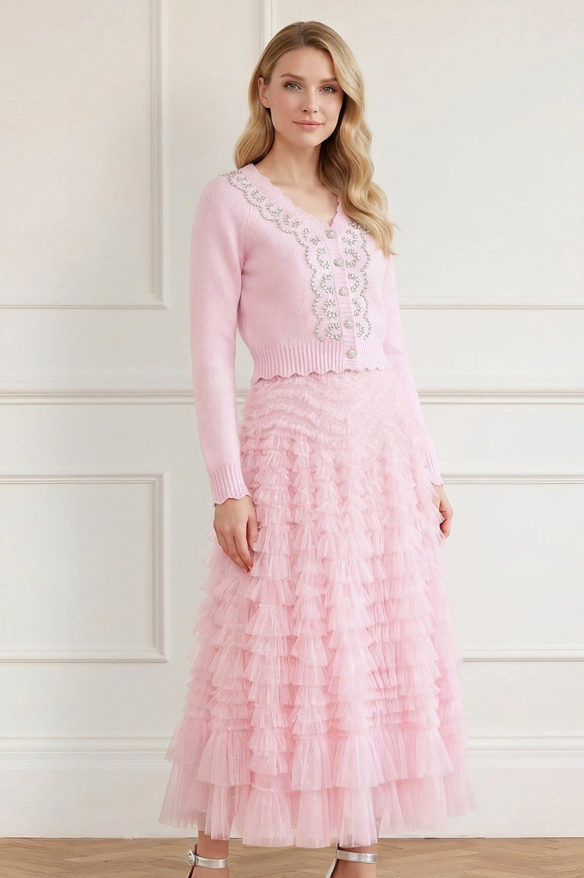 NEW SEASON | NEEDLE & THREAD EXCLUSIVE. The Embellished V-Neck Short Cardigan in Powder Pink. Delicately adorned with intricate embellishment for a refined, feminine finish. Designed with a flattering V-neckline and softly fitted silhouette, this piece offers subtle texture and light-catching detail.