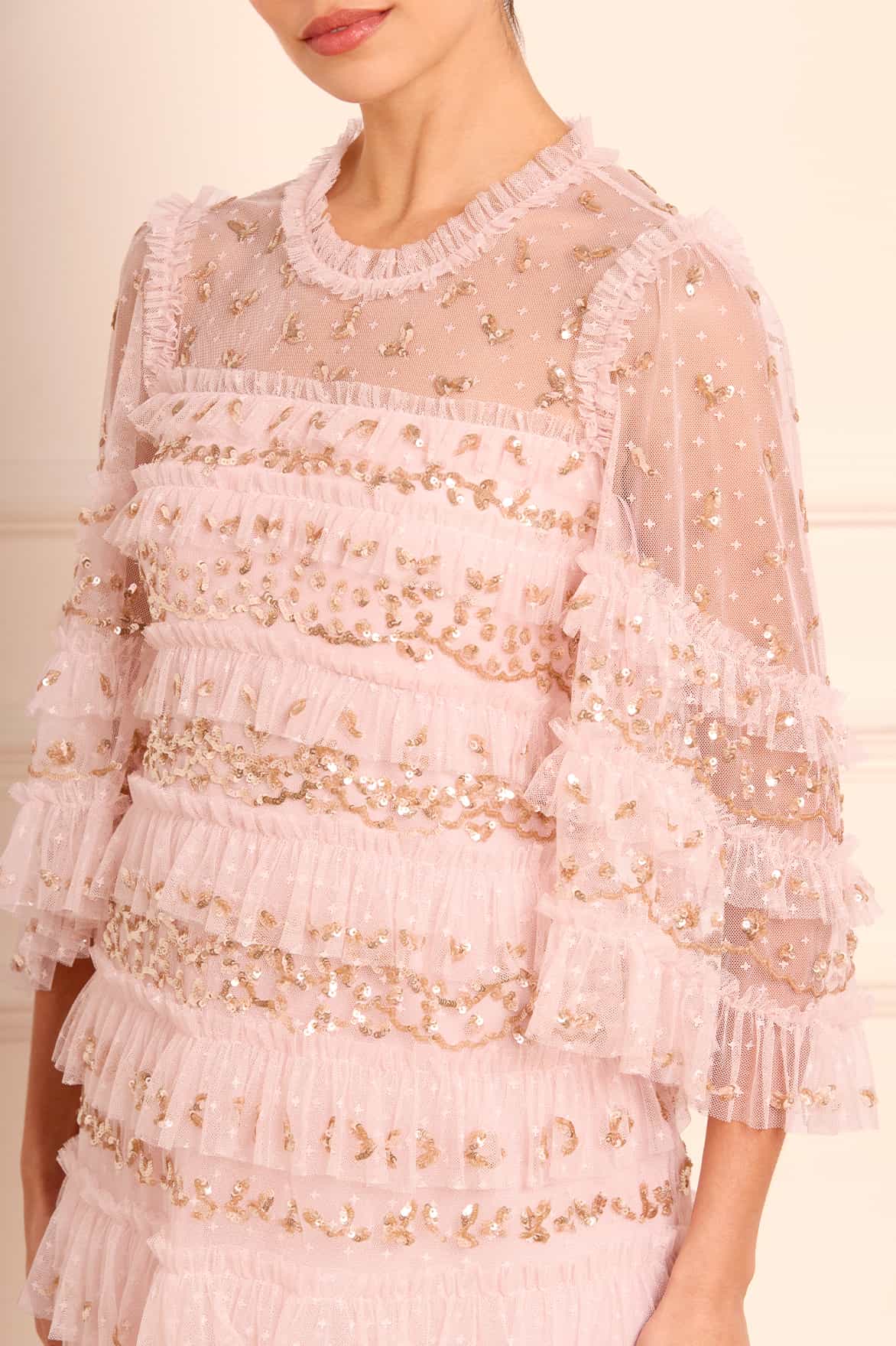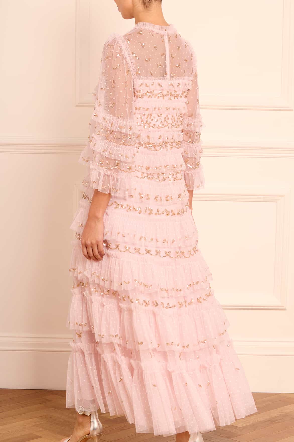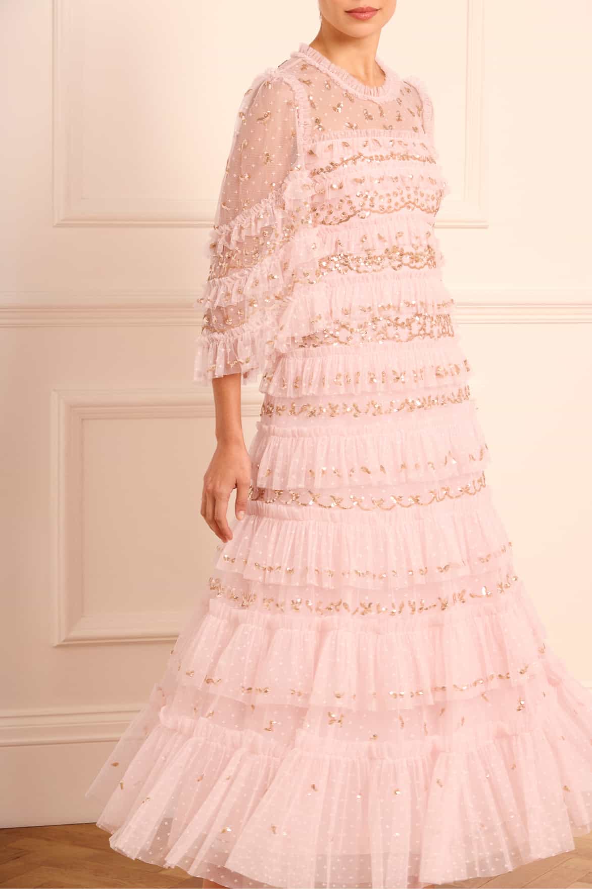 The Emily Lace Ankle Gown in Dusk Pink/Caramel. This ethereal gown is adorned with delicate sequin embellishments, arranged in intricate border designs that capture the essence of vintage romance. Developed with signature Needle & Thread tulle frills cascade down the gown, gradually increasing in size as they reach the hem, each one adorned with glittering sequins for a captivating sparkle. Crafted with romantic fluted sleeves, featuring a delicate leaf motif and frills at the cuff, adding a touch of charm to this timeless piece. Designed for elegance and comfort, the gown boasts a loose-fit silhouette with perfectly proportioned gathered tiers, offering a flattering and effortless wear. Whether for a special occasion or a moment that calls for something truly unique, the Emily Lace Ankle Gown is a breathtaking choice that combines vintage inspiration with contemporary luxury.