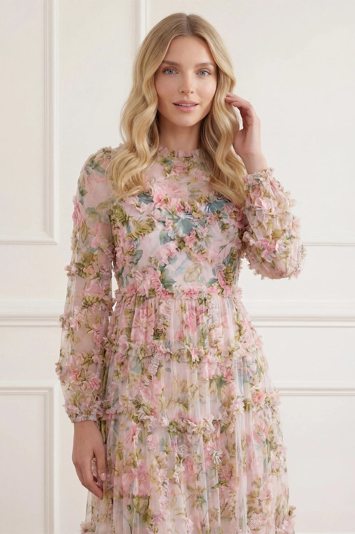 - Floral printed tulle decorated with printed tulle frills across the bodice, skirt and sleeve