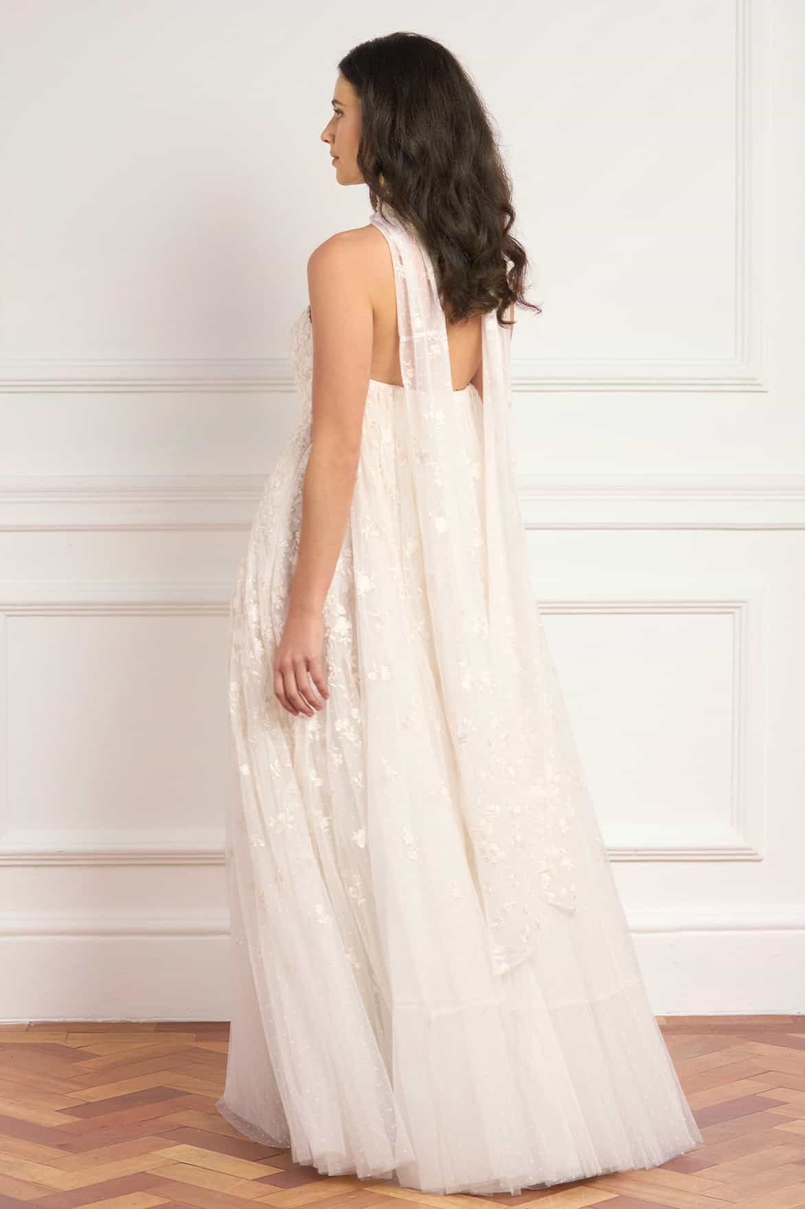- Kisses tulle decorated with floral embroidery.