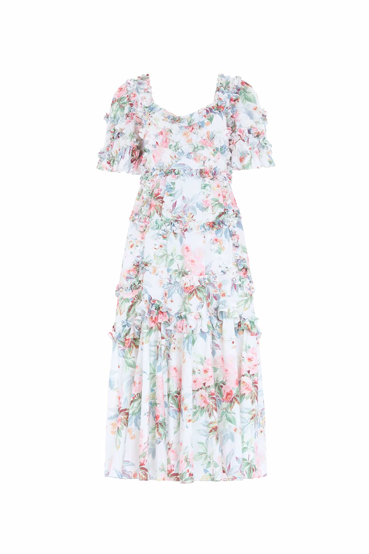 - Floral printed crepe decorated layers of ruffles