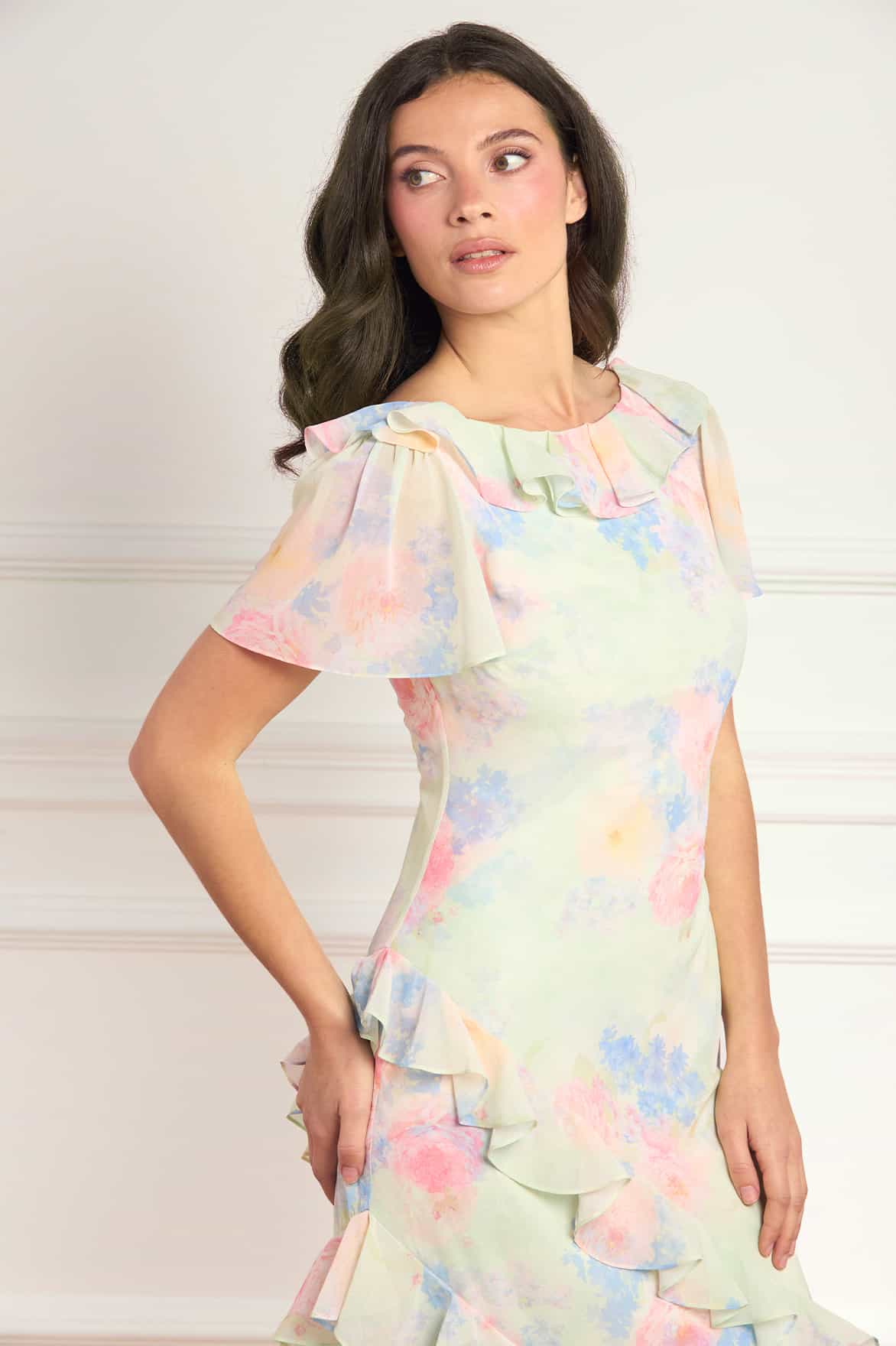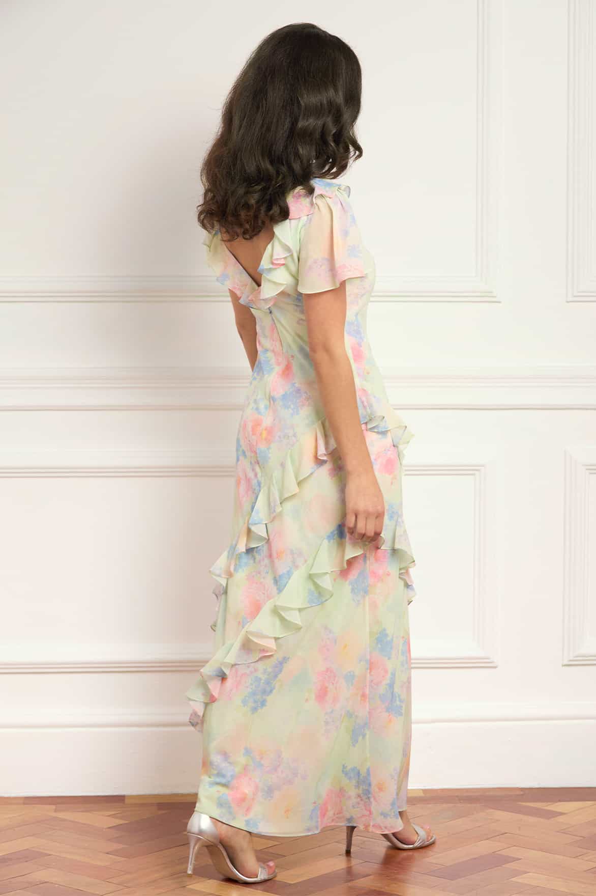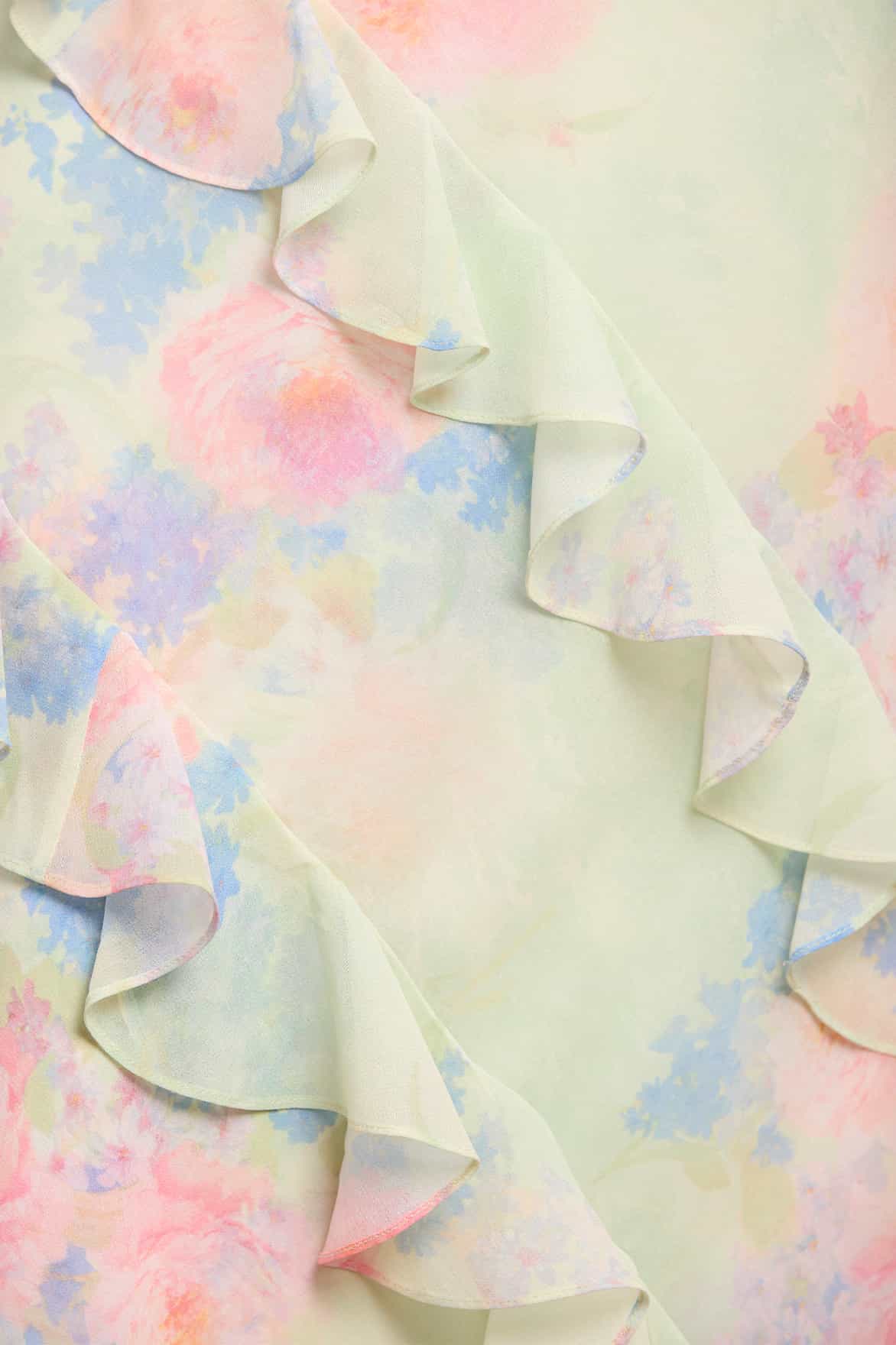 NEW SEASON | NEEDLE & THREAD EXCLUSIVE. The Peony Bloom Georgette Short Sleeve Gown in Peppermint. This romantic gown features a soft floral print inspired by historic garden artwork, with peony bouquets and trailing daisies throughout. Cut on the bias for a fluid drape that effortlessly skims the body, finished with short sleeves for graceful movement.