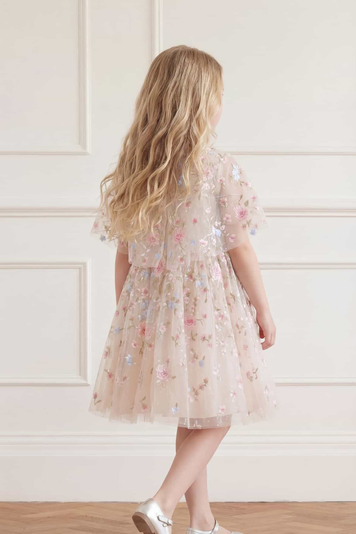 NEW SEASON. The Peony Bouquet Cape Kids Dress in Cream/Multi. This elegant kids dress features exquisite floral embroidery cascading gently across the design. Finished with a flowing cape detail and full skirt, it offers a timeless and refined silhouette. Perfect for a special occasion.