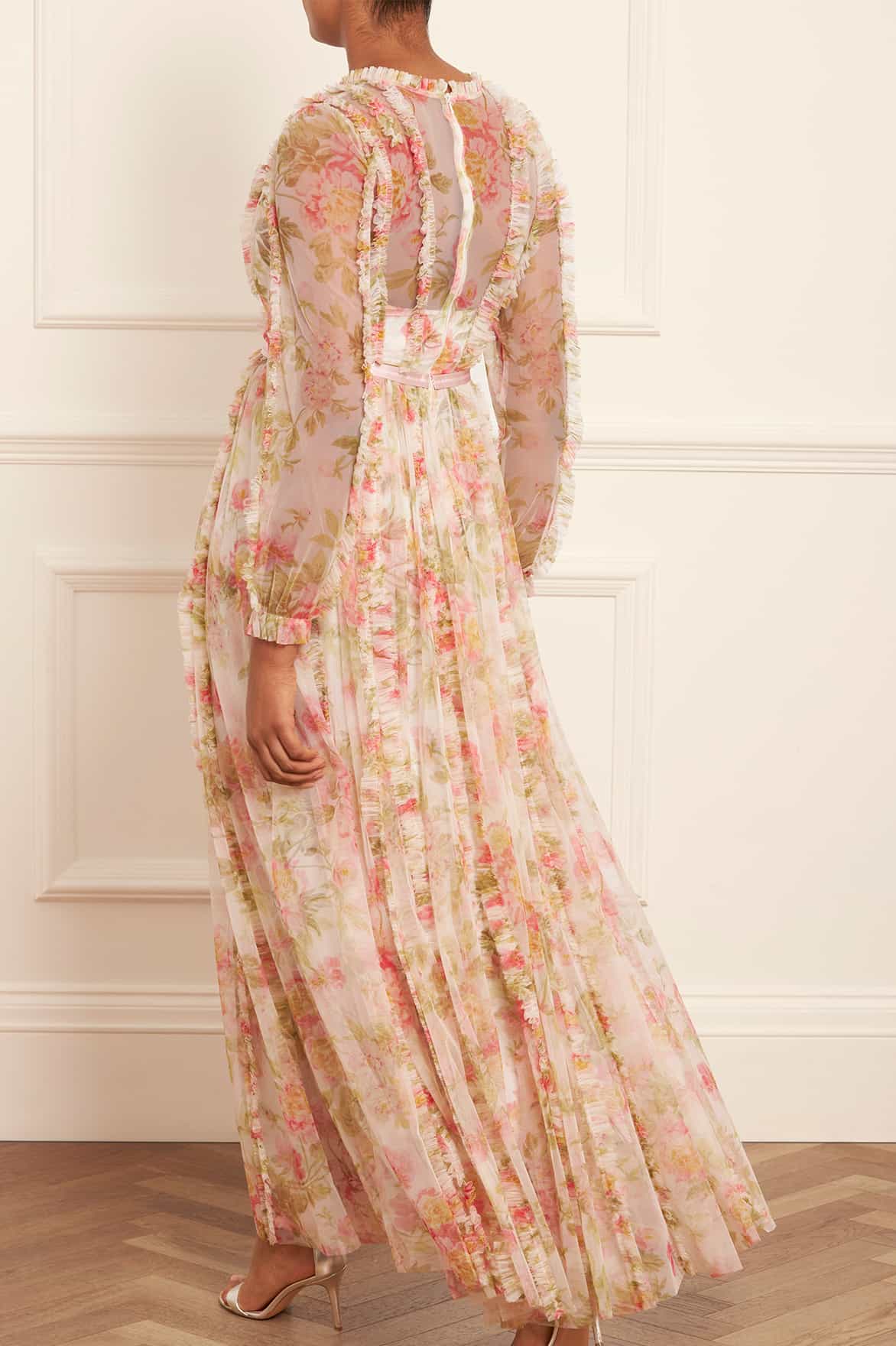 Peony. Promise V-Neck Gown in Moonshine. This gown is printed beautifully with hand-painted sunset pink peonies.. Beautifully created in our soft, delicate tulle fabric for a romantic look. Developed with gently gathered frills, stitched vertically throughout this style to create an ethereal texture to this signature Needle & Thread style. A style you'll wear time and time again.