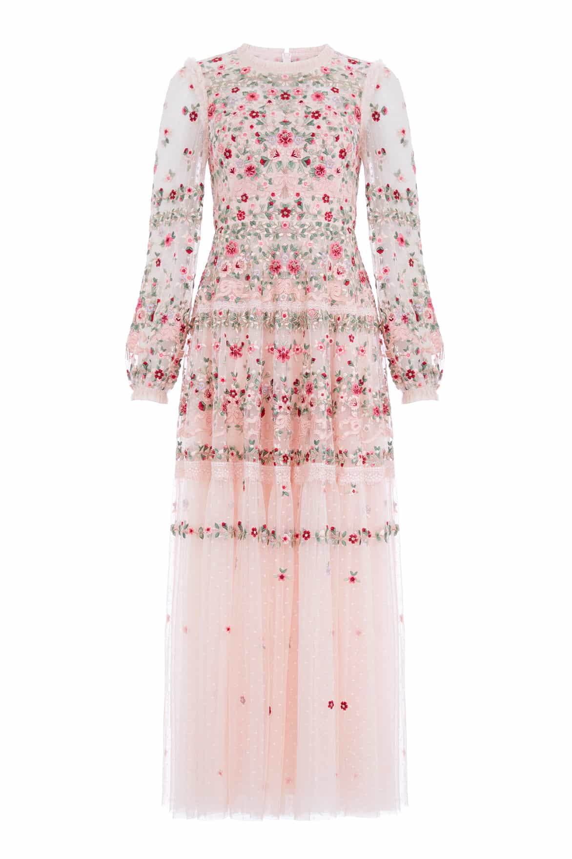 NEEDLE & THREAD EXCLUSIVE. The Ribbon Bouquet Gown in Petal Pink. This gown is intricately designed with embroidered bouquets of flowers in rich tones, inspired by a 1930s vintage print. Beautifully adorned with delicate lace trims for signature Needle & Thread detailing. The skirt is developed with layers of tulle to create a romantic silhouette. The perfect gown for an upcoming occasion.