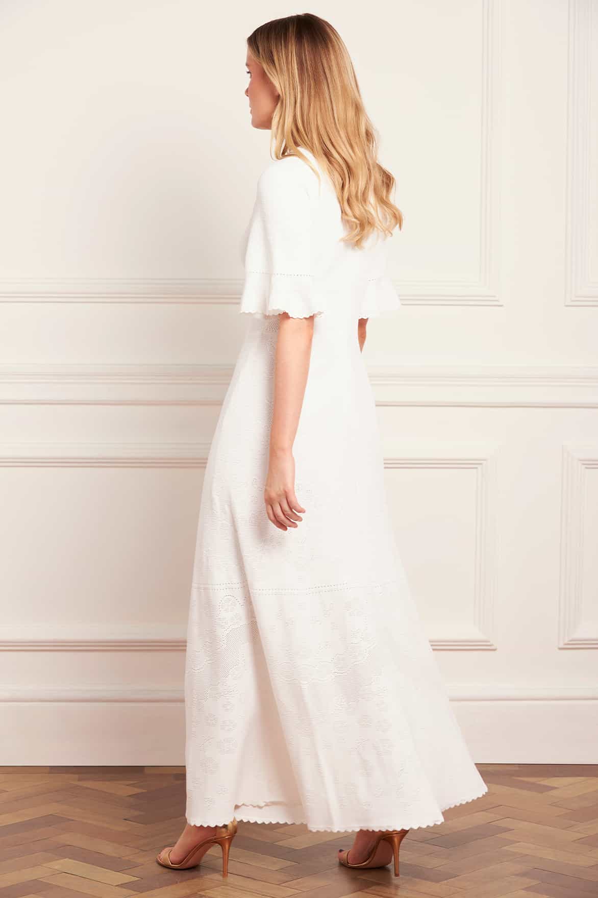 NEW SEASON. The Scallop Lace Pointelle Knit Gown in Cream. A graceful knit design with a scalloped neckline and soft lace detailing. Combining delicate craftsmanship and fluid drape, it offers a modern twist on timeless romance.