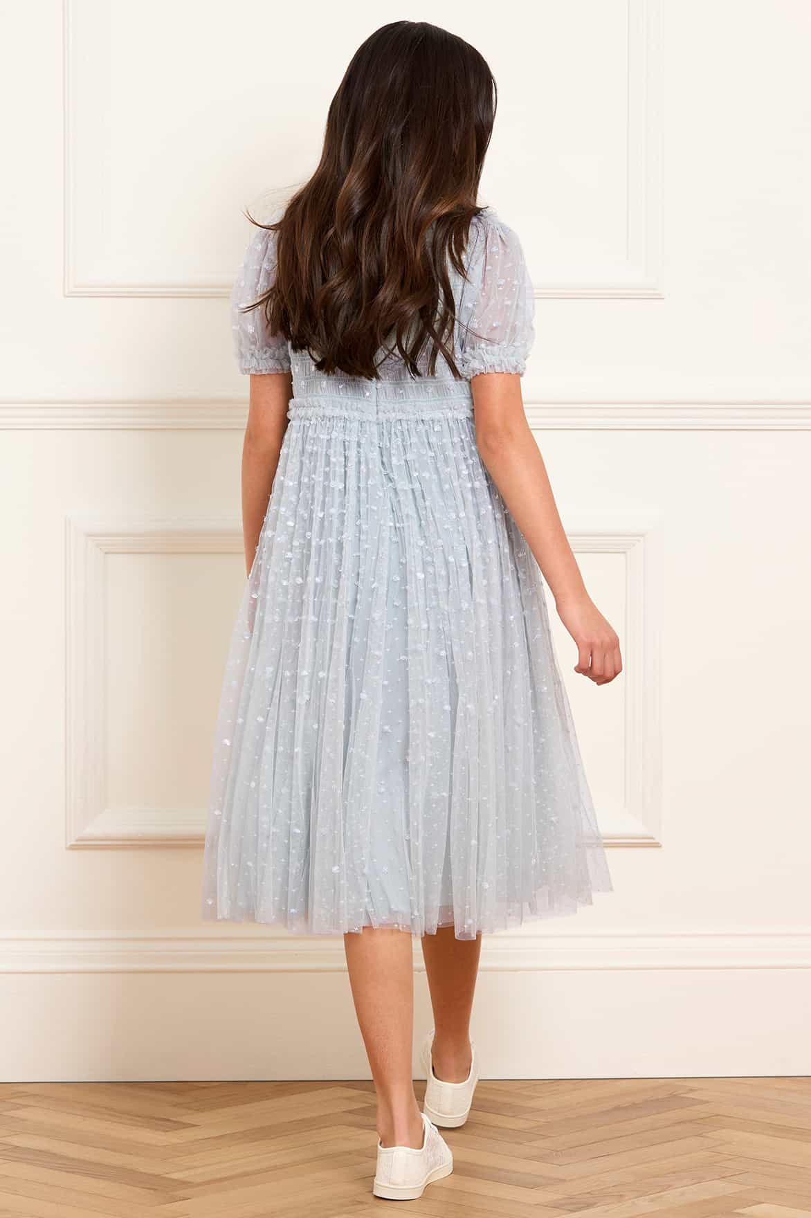 The Sequin Giselle Kids Dress in French Blue. This enchanting dress features glittering sequin dot motifs that scatter toward the hem, with a high-shine foil finish for added lustre. The shirred bodice and short puff sleeves with tulle frill cuffs create a charming silhouette, while signature Needle & Thread ruffles at the neckline, shoulders, and waist add a pretty touch. The voluminous tulle skirt offers beautiful fullness—perfect for twirling.