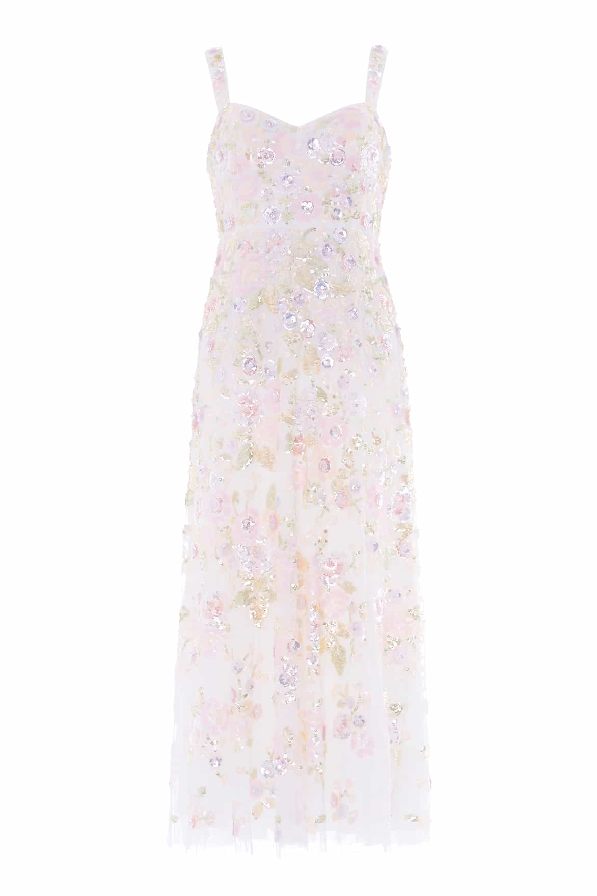 NEW SEASON | NEEDLE & THREAD EXCLUSIVE. The Sequin Paradise Sweetheart Ankle Gown in Swan White/Multi. This romantic ankle-length gown features statement sequin floral artwork that softly graduates towards the hem. Designed with a flattering sweetheart neckline and flowing skirt, the silhouette enhances feminine movement.