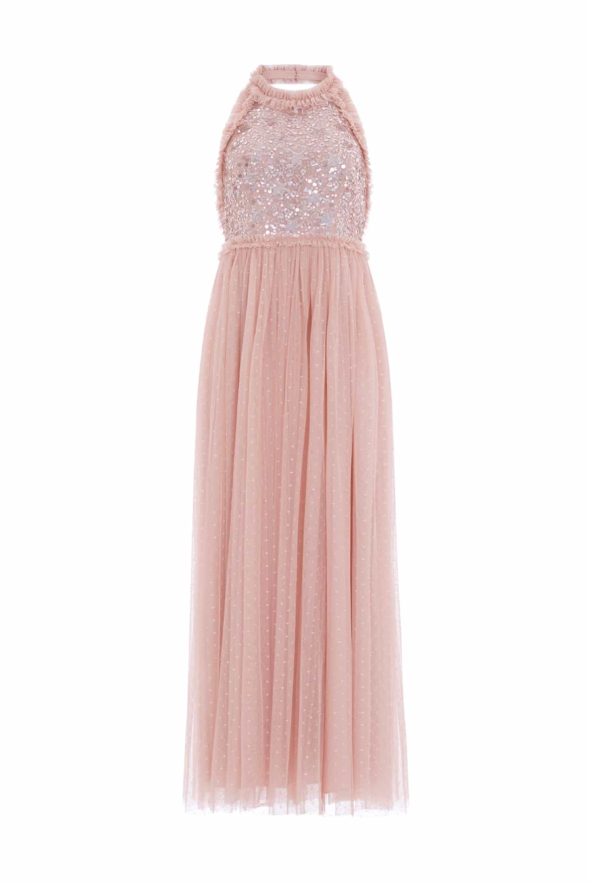 The Shooting Stars Bodice Halter-Neck Ankle Gown in Rose Gold. This gown is inspired by the extravagant costumes worn by the Follie’s dancers of the early 1900s. The bodice of the gown is decorated with shimmering embellishments of intricate star motifs with scatters of tiny glittering sequins that evoke the beauty of a night sky. Designed with a halter neck and frothy signature Needle & Thread soft tulle ruffles. The skirt is developed from layers of signature Needle & Thread soft tulle. The perfect gown for an upcoming special occasion or bridesmaid moment.
