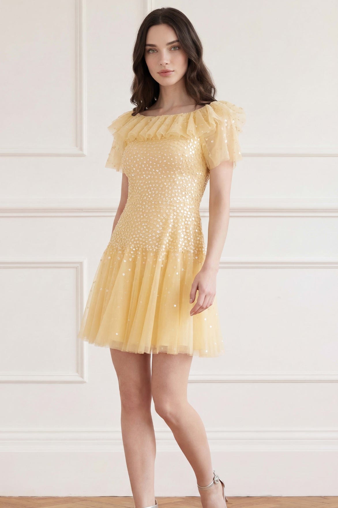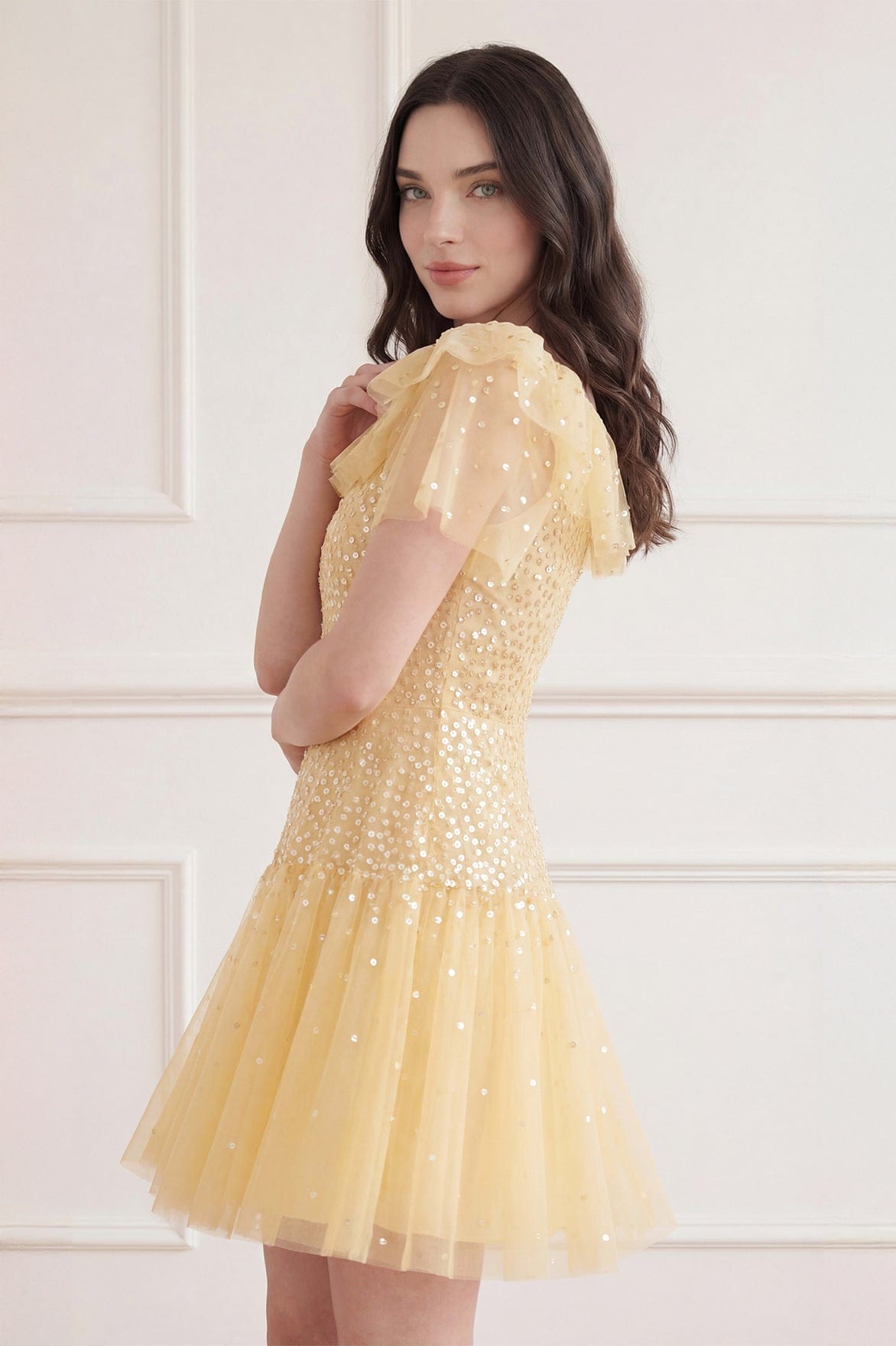 NEW SEASON. The Sunrise Sequin Short Sleeve Micro Mini Dress in Citron. A playful micro mini dress adorned with shimmering sequin dot motifs inspired by glowing sunrise light. Designed with short sleeves and a fitted silhouette for modern, statement occasionwear.