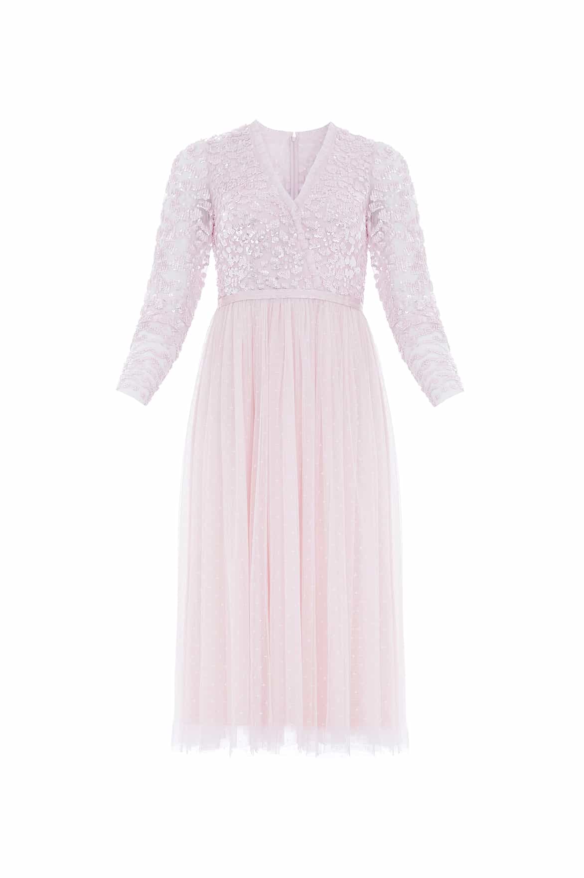 NEEDLE & THREAD EXCLUSIVE. The Tempest Bodice V-Neck Midaxi Dress in Sky Pink. This beautiful dress is inspired by a pretty vintage lace tablecloth design. The bodice is adorned with sequins, creating an all-over shimmer effect. Crafted with long sleeves, a v-neckline and a tulle multi-layered skirt. Make an entrance in the Tempest at your next event.