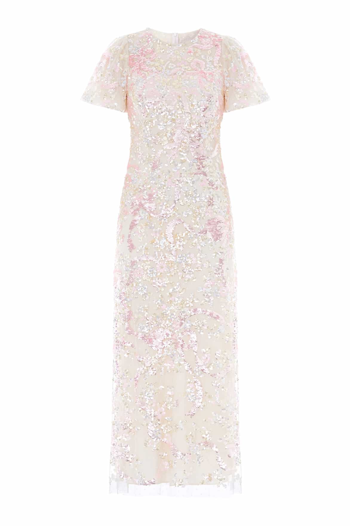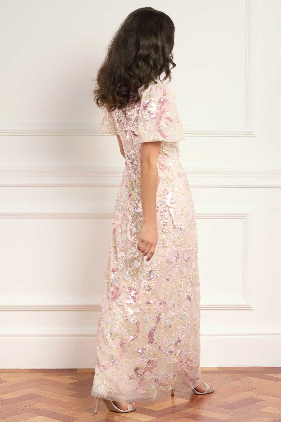NEW SEASON. The Dancing Ribbon Puff Sleeve Gown in Cream/Multi. Exquisite sequin artwork depicts dancing ribbons and floral motifs in an organic trailing formation across the gown. Designed with puff sleeves and a slim silhouette, this style elongates the figure with delicate sparkle.