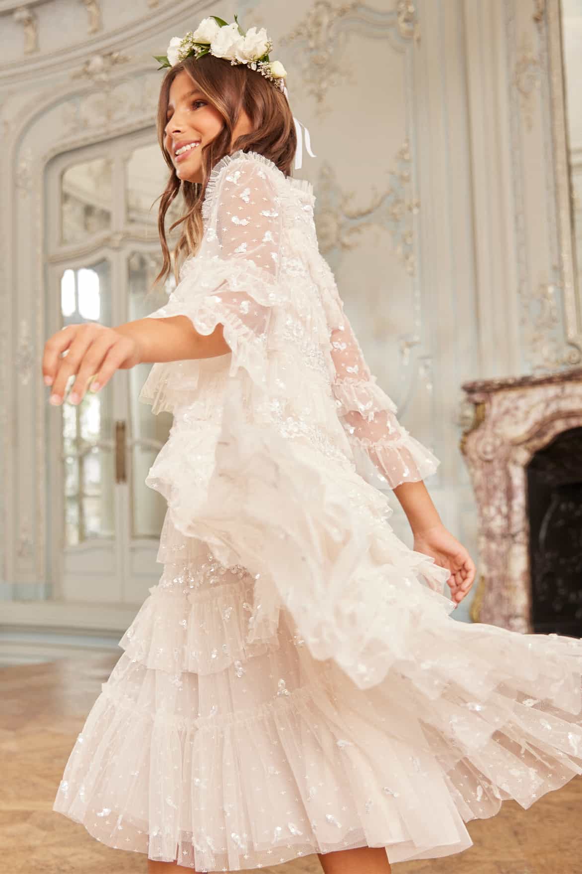 The Emily Lace Kids Dress in Cream. Inspired by vintage lace, this playful dress features delicate sequin embellishments and intricate border designs. Tulle frills, adorned with glittering sequins, gradually fan out towards the hem, while fluted sleeves with a leaf motif add a whimsical touch. The loose-fit silhouette offers comfort and ease, making it a timeless favourite for your little one’s wardrobe.