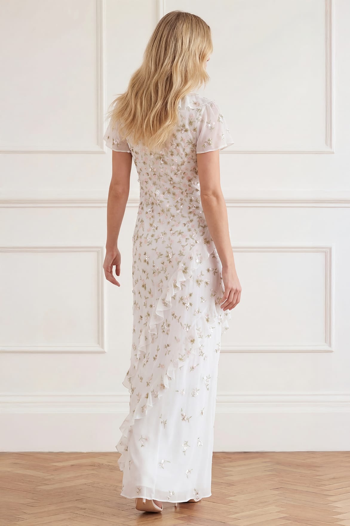 NEW SEASON. The Meadow Ditsy Georgette Gown in Swan White/Peach. This elegant georgette gown features romantic Meadow Ditsy embroidery inspired by the last blooms of summer. Cut on the bias for a smooth, body-skimming fit and effortless wear, the silhouette flows beautifully from bodice to hem.
