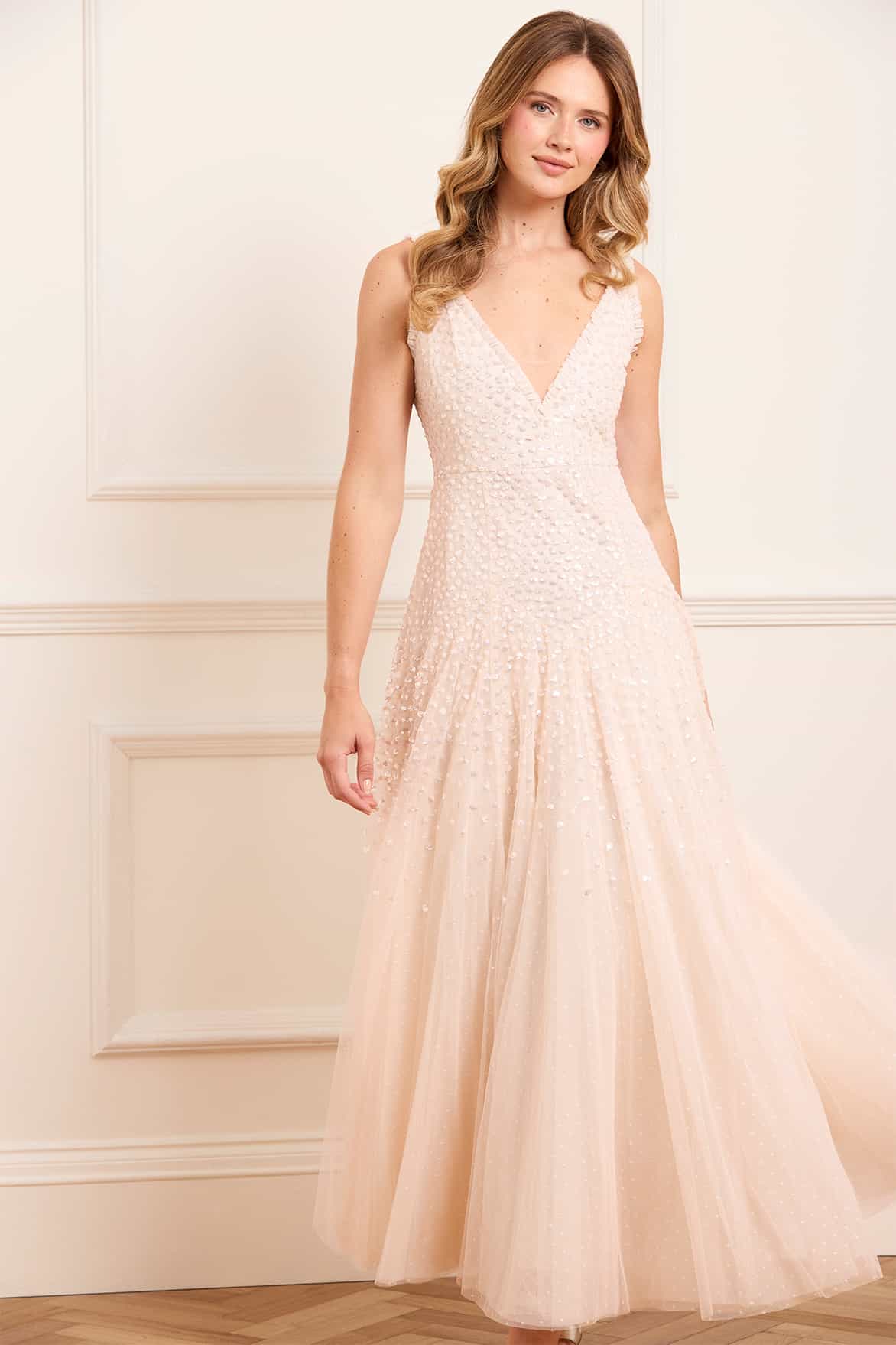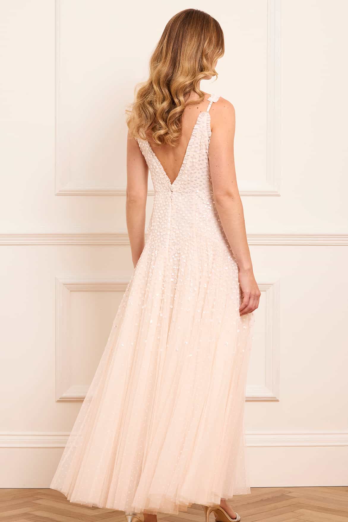 The Sequin Cascade Cami Plunge Gown in Opal/Cream. This beautiful dress features shimmering embellishment in contrast cream tones. The deep V neckline and layered tulle skirt create a flowing silhouette, while the sequins scatter across the surface for an iridescent effect. A captivating piece for unforgettable looks.