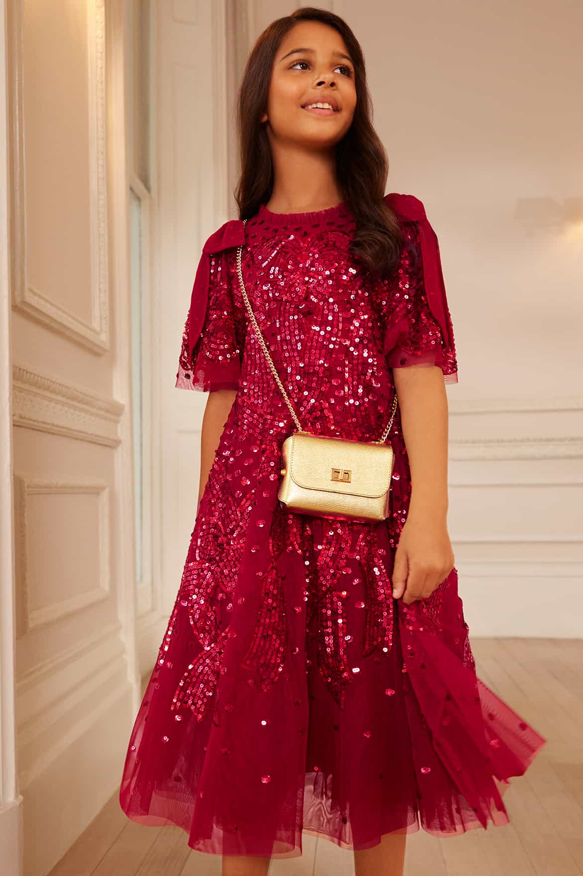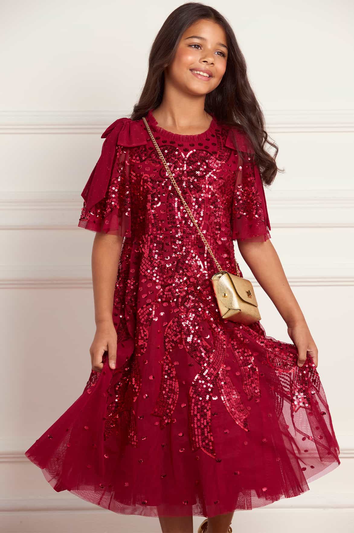 NEW SEASON. The Sequin Ribbon Bow Kids Dress in Red. Crafted in soft layers of tulle, the dress is adorned sequin embroidery that twinkles with movement. A charming bow detail at the neckline adds youthful charm, while the bold red palette makes it perfect for festive celebrations. Pair with the Sequin Ribbon Off-Shoulder Ankle Gown in Red from the womenswear collection for a striking coordinated look.