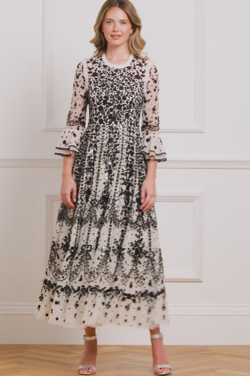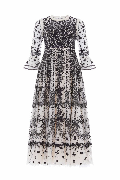 NEW SEASON. The Adeline Round Neck Ankle Gown in Cream/Graphite. This beautiful dress combines refined craftsmanship with striking detail. The round neckline offers a demure balance to the richly embellished bodice, adorned with lace-inspired embroidery, miniature bows and cascading florals. Scalloped borders flow seamlessly into the ankle-length hem, designed to flatter and flow with every movement. A standout look for refined events dressing.