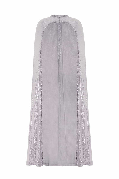 NEW SEASON. Amora Long Cape in Dove/Silver. A celestial-inspired layer designed to elevate evening dressing. Crafted in delicate tulle, the cape is embellished with shimmering sequins in silver tones, creating a starry sky effect that sparkles with movement. The dove-grey base softens the metallic embellishment, adding refinement and romance. A statement piece that transforms any gown, perfect for dramatic entrances and ethereal styling.