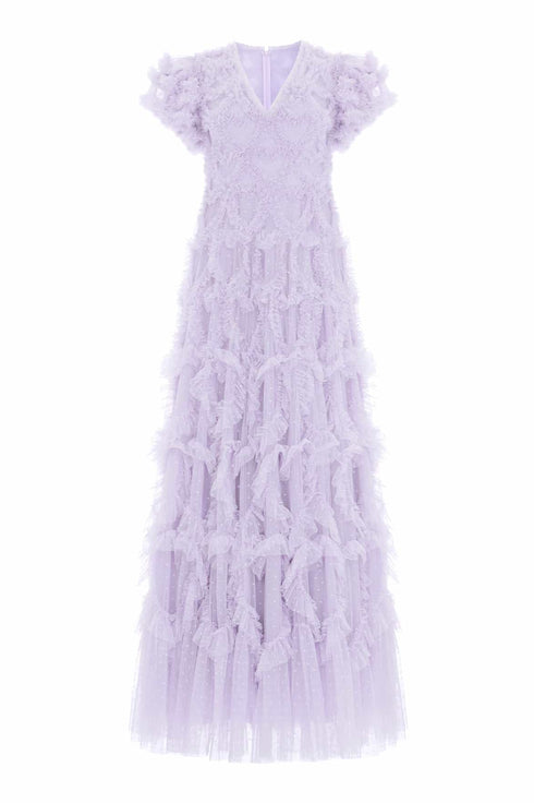 The Amorette V-Neck Gown in Dusk Lilac. A signature Needle & Thread style; beautifully adorned with our key love heart motif, made from gently gathered delicate tulle. Designed with romantic, frothy sleeves created using layers of delicate tulle and frills for a statement look. Featuring a generously voluminous skirt layered with tulle and net for a full, magical silhouette. A textile piece you'll forever treasure.