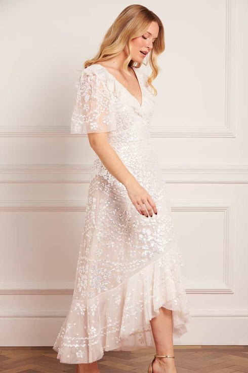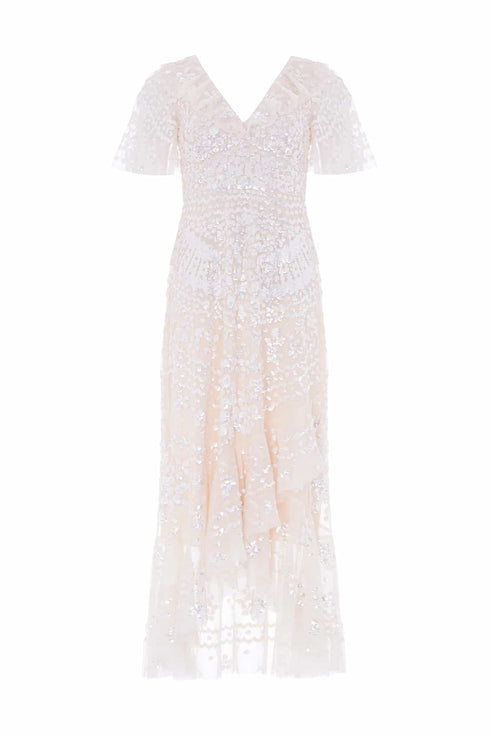 NEW SEASON. The Anais Sequin Frill Ankle Gown in Cream. Inspired by charcoal drawings of vintage French lace. Embellished with shimmering sequins and romantic circle-cut frills, this cream tulle gown captures timeless glamour with delicate fluted sleeves and elegant fluidity