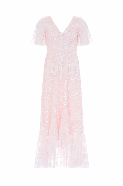 NEW SEASON. The Anais Sequin Frill Ankle Gown in Seashell. A beautifully romantic piece featuring lustrous sequins and frothy frills inspired by antique lace. Crafted from soft tulle with graceful movement, this gown evokes vintage artistry in a soft, feminine tone.