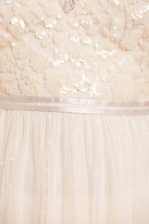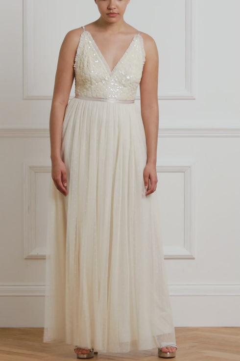 The Aurelia Bodice Cami Gown in Champagne. This Needle & Thread signature style is beautifully designed with floral lace artwork inspired by a vintage tablecloth. Adorned with shimmering sequins on the bodice gently flowing into a soft tulle full length skirt. Make an entrance in the Aurelia.