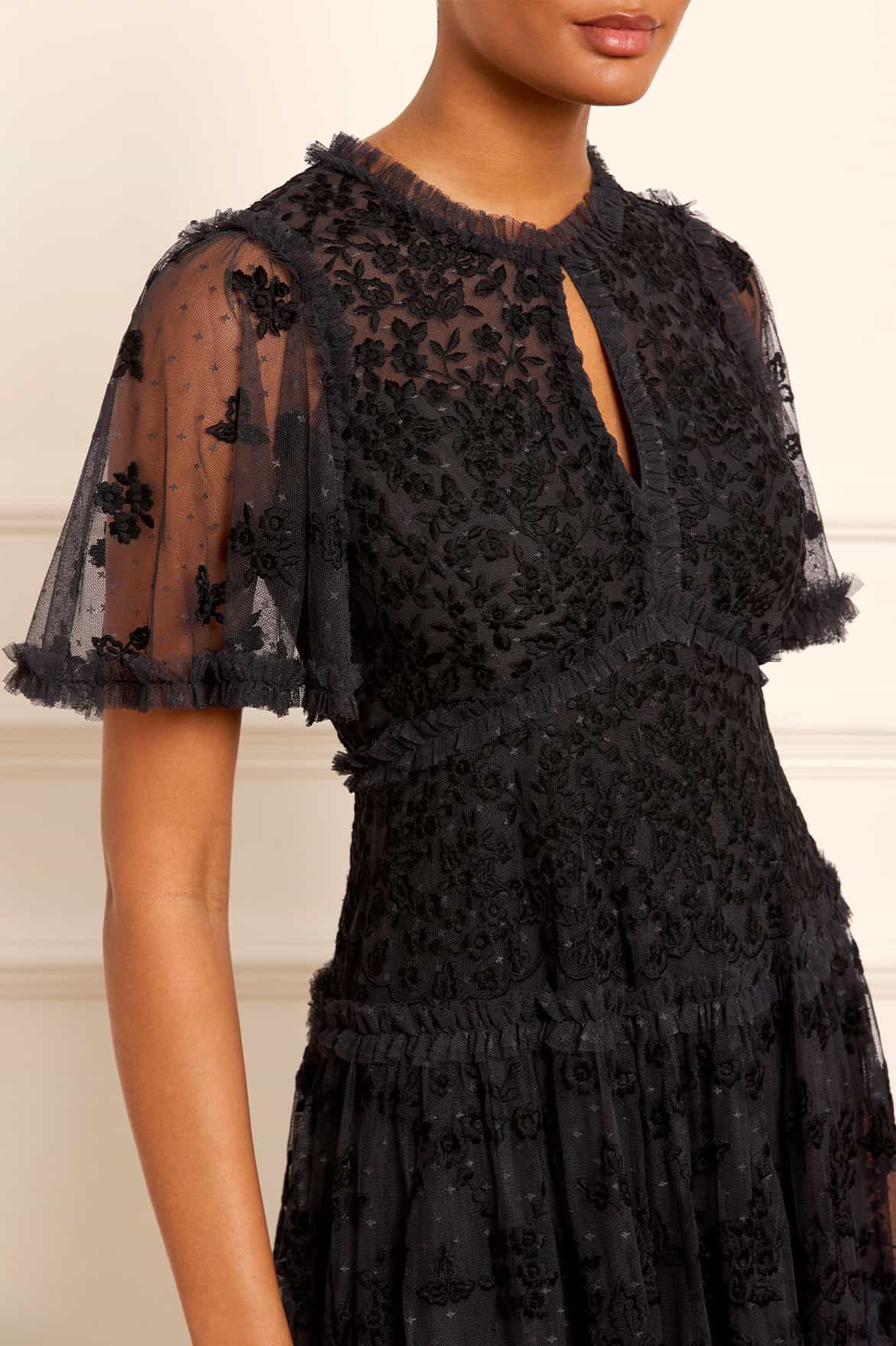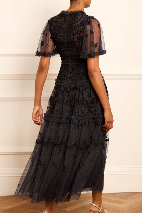The Autumn Lace Ankle Gown in Graphite. This signature Needle & Thread style is designed with floral motif embroidery inspired by antique lace designs. This gown is developed with romantic fluted sleeves, a gathered tiered hem, and is created from layers of soft tulle to create a flattering silhouette. A classic and contemporary style.