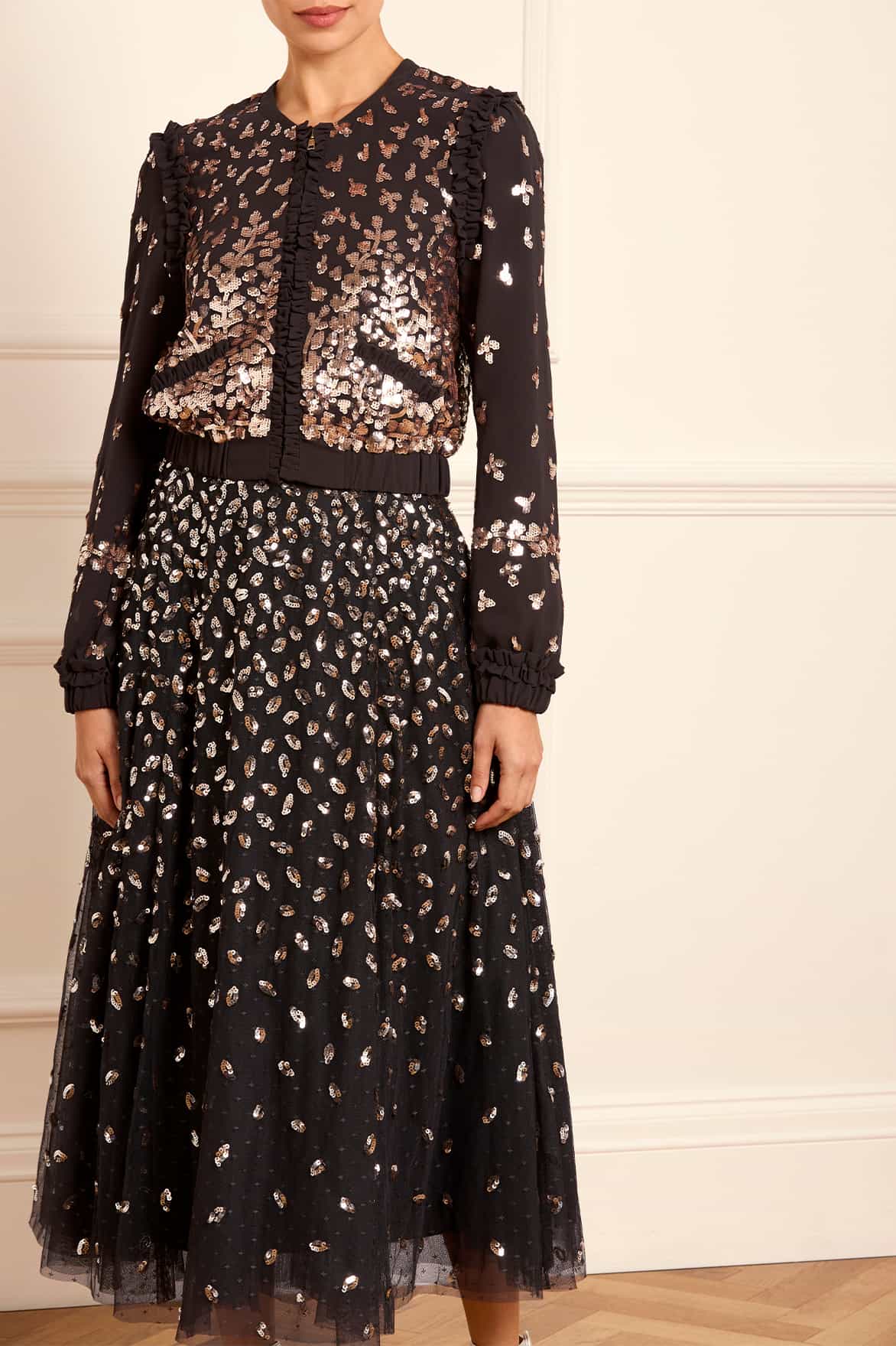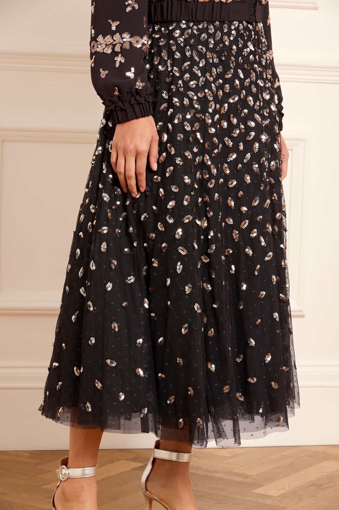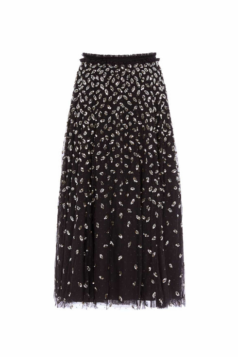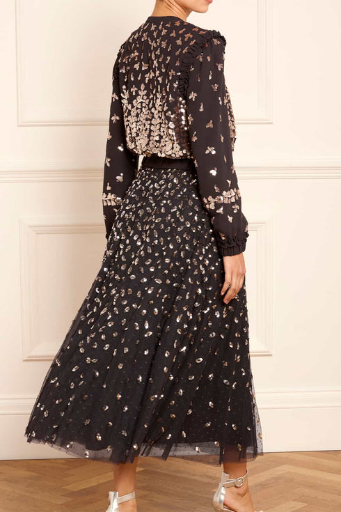 The Autumn Leaves Ballerina Skirt in Graphite / Caramel. Our signature tulle skirt with a refresh for the season ahead. Needle & Thread are introducing decorated skirts into our new Autumn/Winter collection. This layered tulle skirt is developed with a generous hem sweep for movement. Beautifully designed with glistening leaf motifs scattered towards the hem to be reminiscent of falling autumn leaves. We recommend styling it with our bomber jacket for maximum impact.