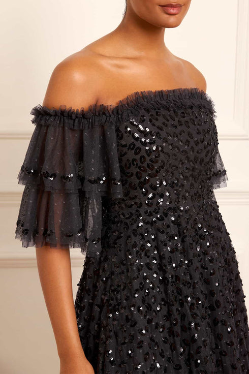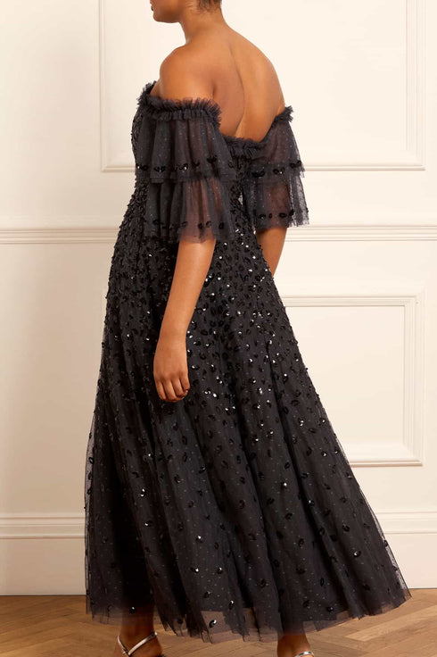 The Autumn Leaves Off-Shoulder Ankle Gown in Graphite. This ethereal piece is adorned with a glittering leaf motif that cascades gently towards the hem, capturing the essence of autumnal elegance. The gown features a romantic off-the-shoulder design complemented by tiered sleeves, each delicately edged with shimmering sequin embellishments. Crafted for comfort and style, the gown includes an internal corset made from stretch power mesh, ensuring a flawless fit while maintaining the garment's structure. The skirt is a true masterpiece, made up of layers of soft, delicate tulle and net, creating a generous and flowing silhouette that’s perfect for any special occasion.